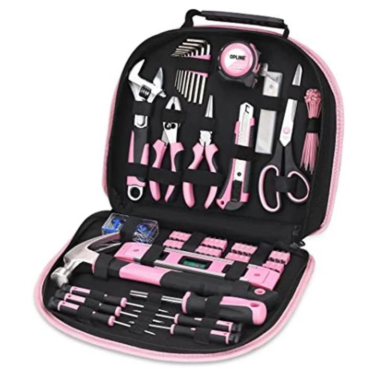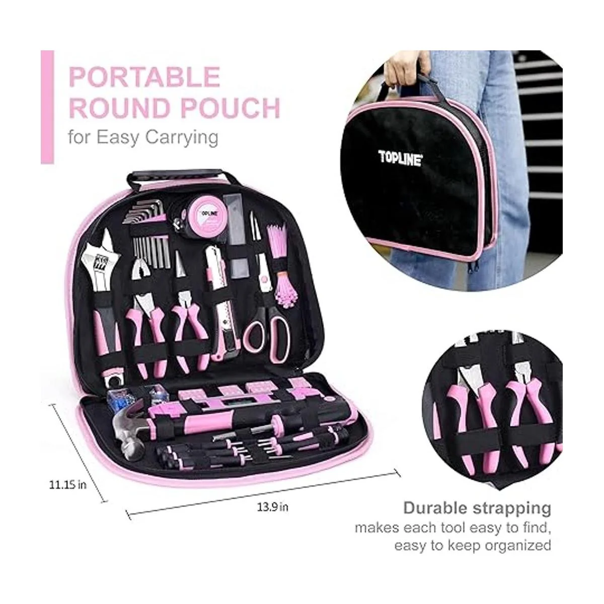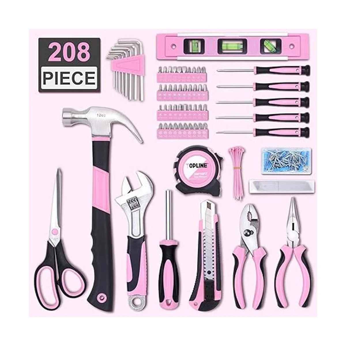 TOPLINE Juego de herramientas para el hogar de 208 piezas para mujer, color rosa con bolsa redonda, kit de herramientas para el hogar para mujeres, kits de herramientas para el mejor regalo y mantenimiento del hogar