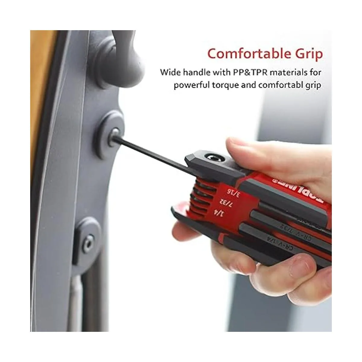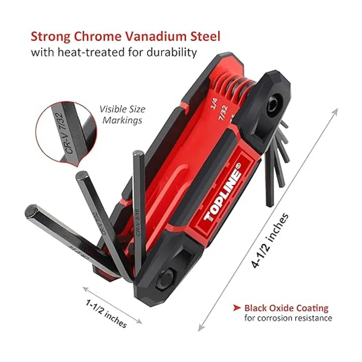 Las marcas de tamaño están impresas en la llave hexagonal para una fácil identificación. Tamaños de llave: 0.059 in, 0.079 in, 0.098 in, 0.118 in, 0.157 in, 0.197 in, 0.236 in, 0.315 in, 5/64 pulgadas, 3/32 pulgadas, 7/64 pulgadas, 1/8 pulgadas, 9/64 pulgadas, 5/32 pulgadas, 1/4 pulgadas, T9, T10, T15, T20, T25, T27, T27, T30, T30, T40, T40