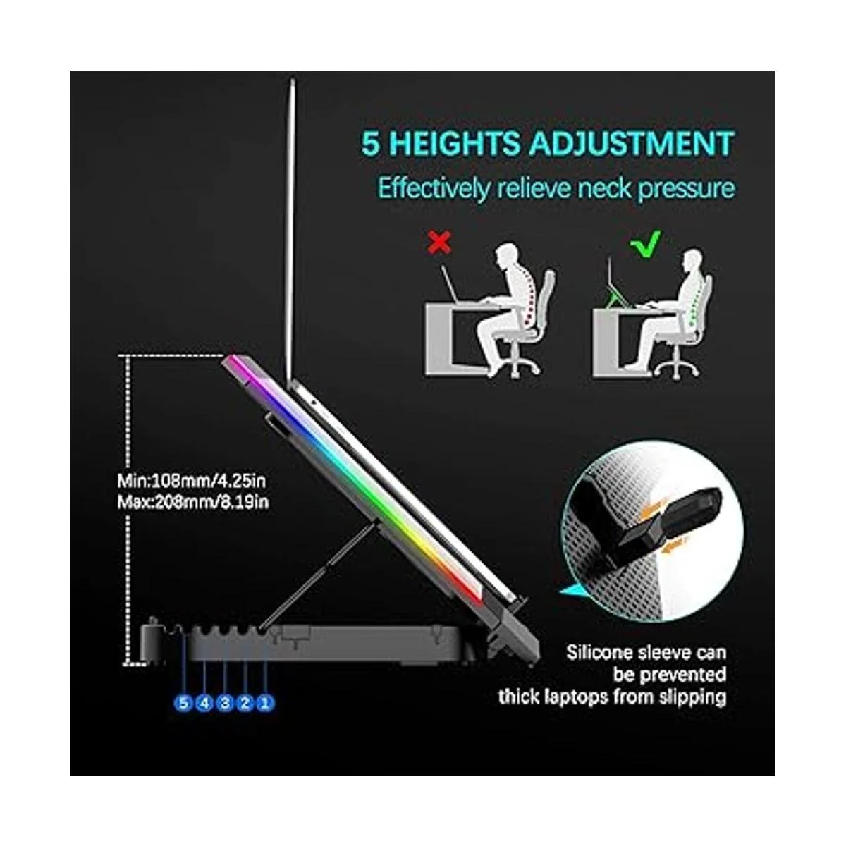 Ajuste de 5 alturas soporte para teléfono móvil: el enfriador para laptop para juegos proporciona 5 tipos de altura ajustable para elegir. Puedes ajustar el ángulo adecuado según tus necesidades para aliviar eficazmente la fatiga de la espalda y el cuello. El soporte del teléfono se almacena en el lado izquierdo del ventilador de refrigeración del portátil, puedes ampliarlo y colocar tu teléfono para ver información fácilmente.