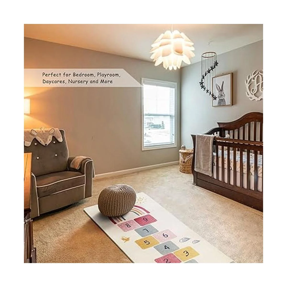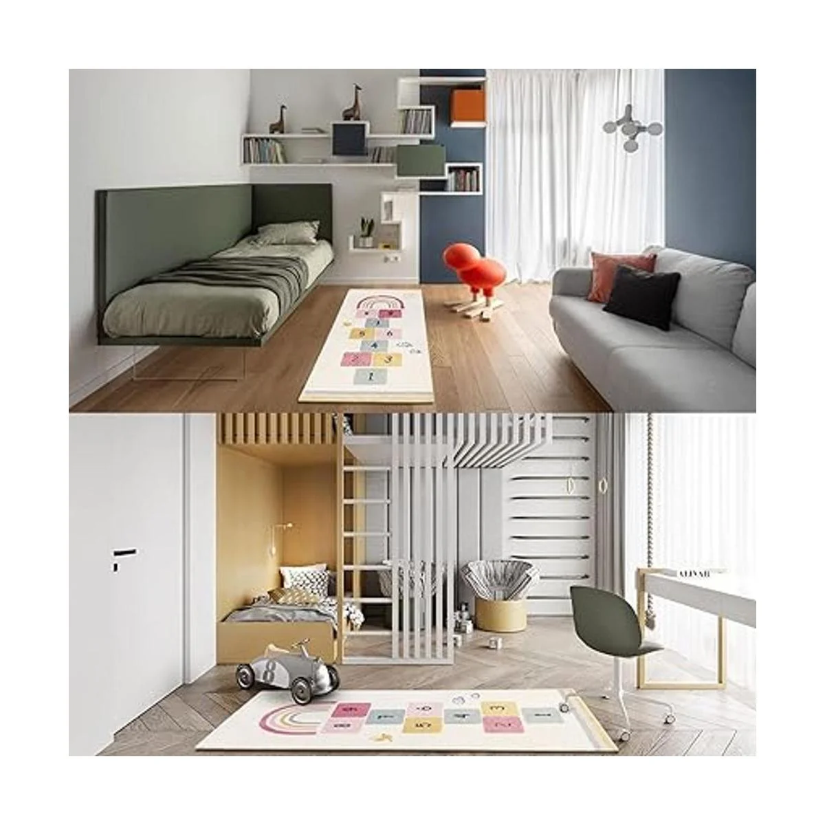 Diseño original: la alfombra cuenta con el clásico juego de hopscotch para horas de salto y entretenimiento de contar. Y contiene colores coloridos y elementos brillantes, como sol, pájaros, cielo arcoíris. Adorna la alfombra para que tus hijos los hagan reír todo el día. Añade disfrute a tu hogar.