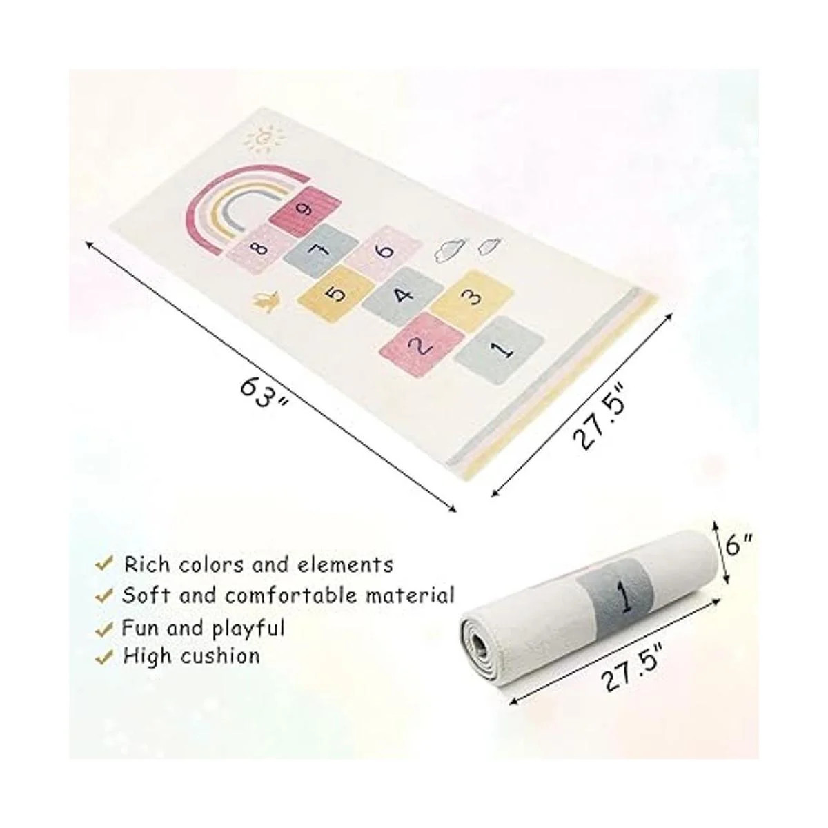 Tamaño adecuado: 27.5 pulgadas de ancho x 63 pulgadas de largo, 0.3 pulgadas de grosor. La alfombra proporciona más espacio para que tu hijo salte y se mueva libremente.
