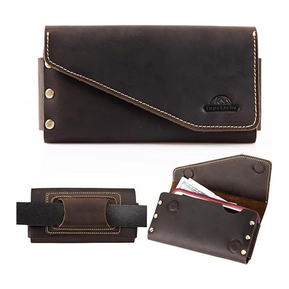 Topstache Funda de cuero para teléfono con lazo para cinturón, cierre magnético para teléfono celular, tarjetero para tarjetas, soporte de cuero hecho a mano para iPhone 13 Pro Max, se adapta a teléfono con funda Otterbox encendida, marrón oscuro