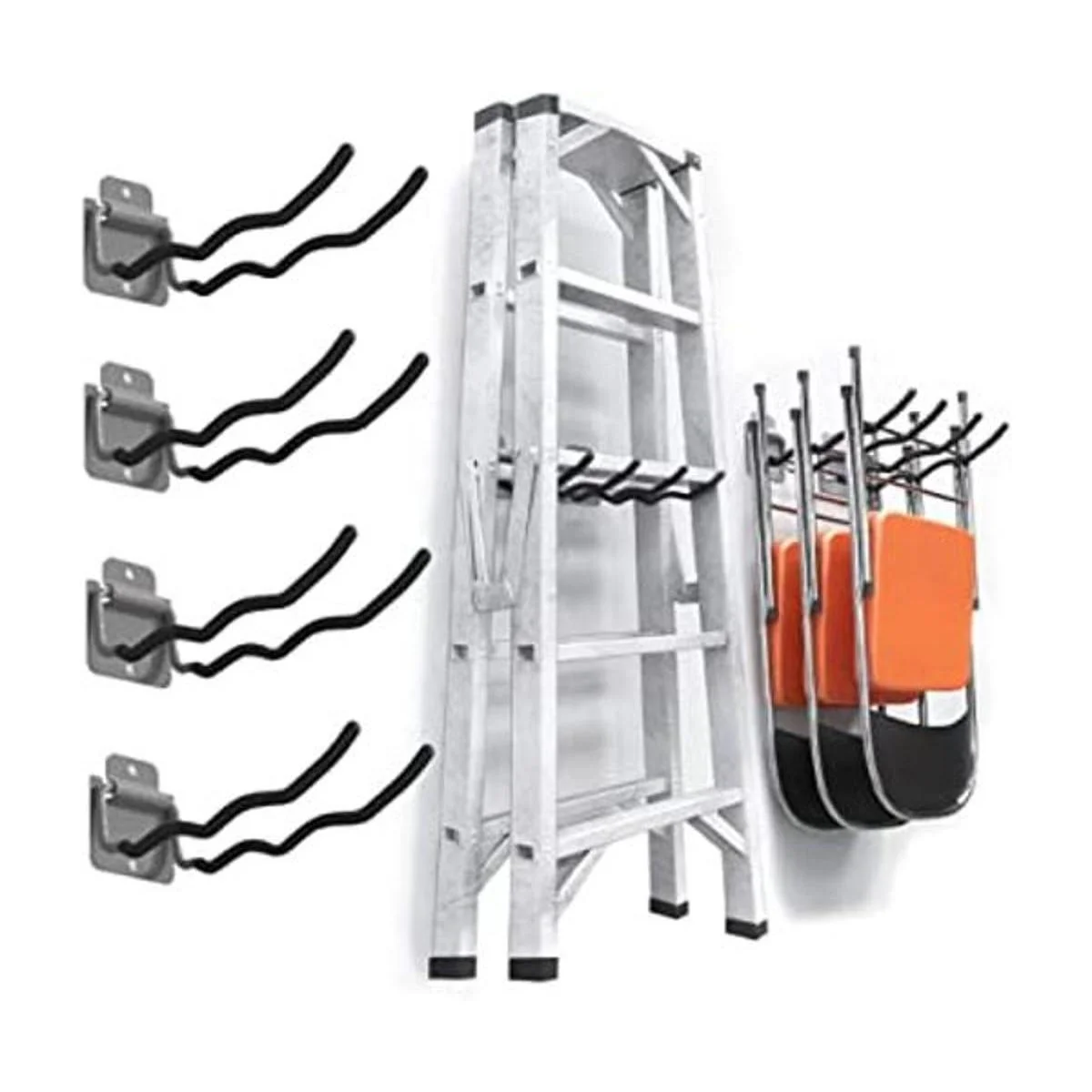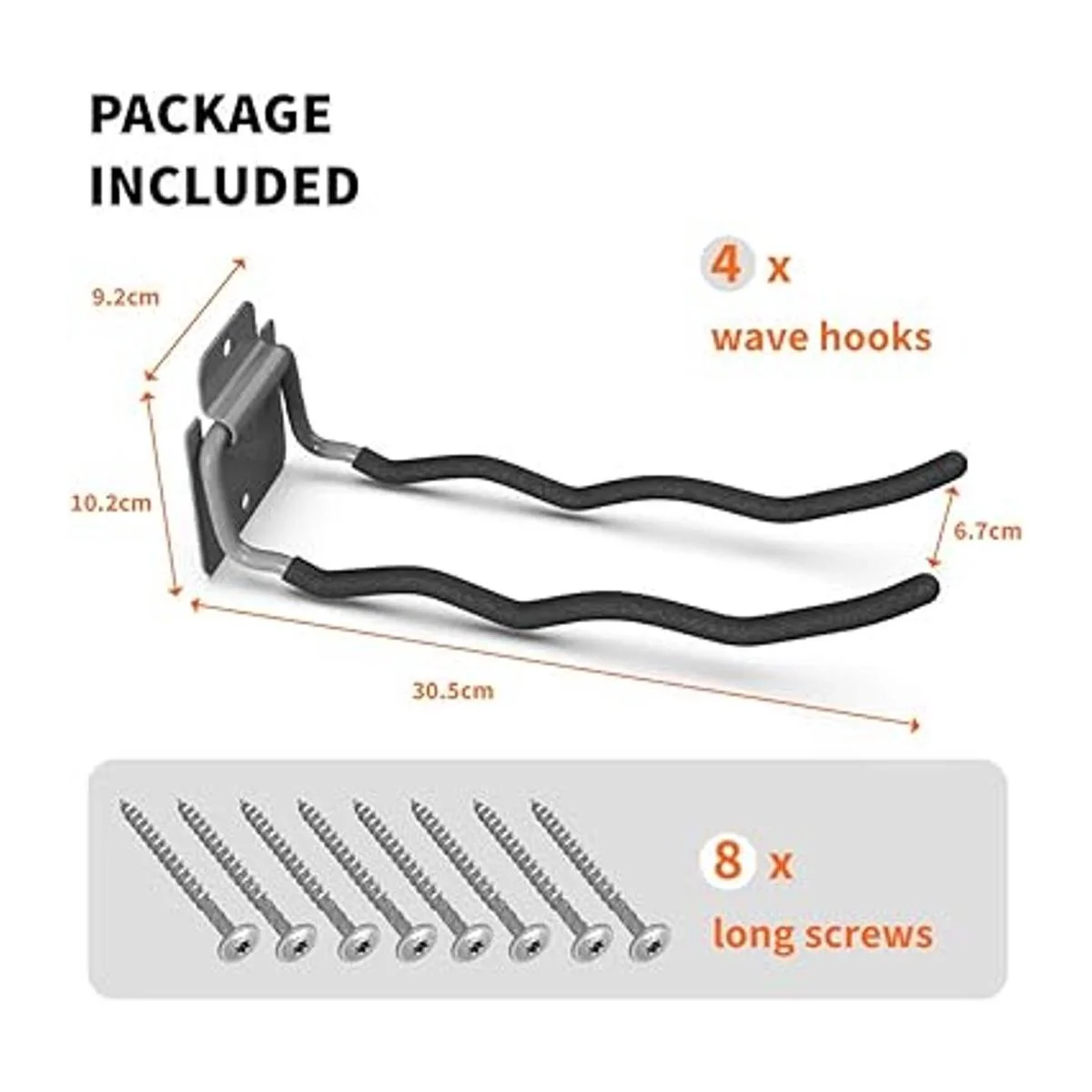 TORACK Organizador de herramientas de ganchos de garaje, paquete de 4 ganchos ondulados de acero resistente de 12 pulgadas, ganchos de almacenamiento de garaje para montaje en pared para neumáticos de coche, escalera, sillas, herramientas eléctricas, herramientas de jardín