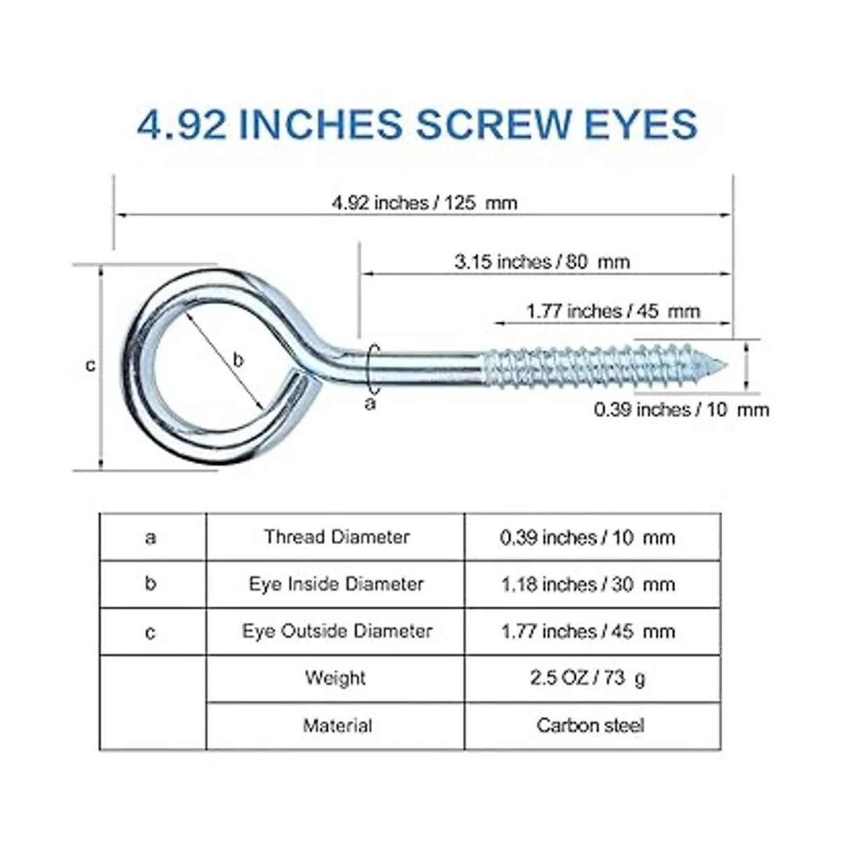 Resistente y de gran tamaño: longitud total: 5 pulgadas o 5.000 in. Diámetro exterior del ojo: 1.772 in. Diámetro interior del ojo: 1.181 in. Los puntos de metal pueden morder en madera, madera contrachapada o paneles de yeso rápidamente sin pelar, proporcionando la máxima resistencia y durabilidad.