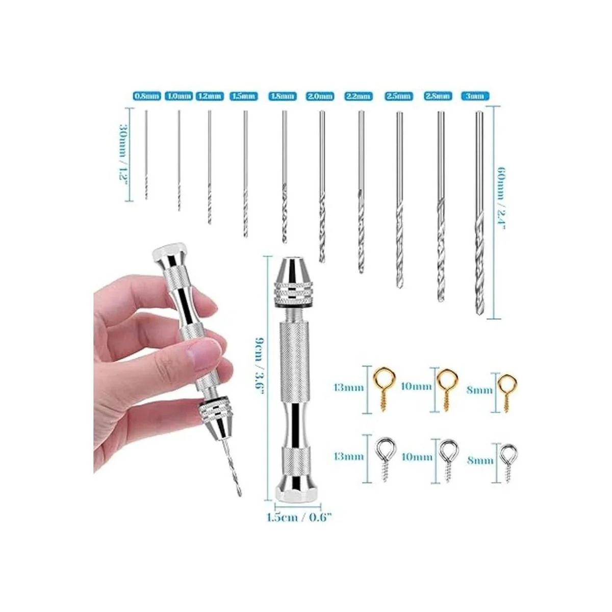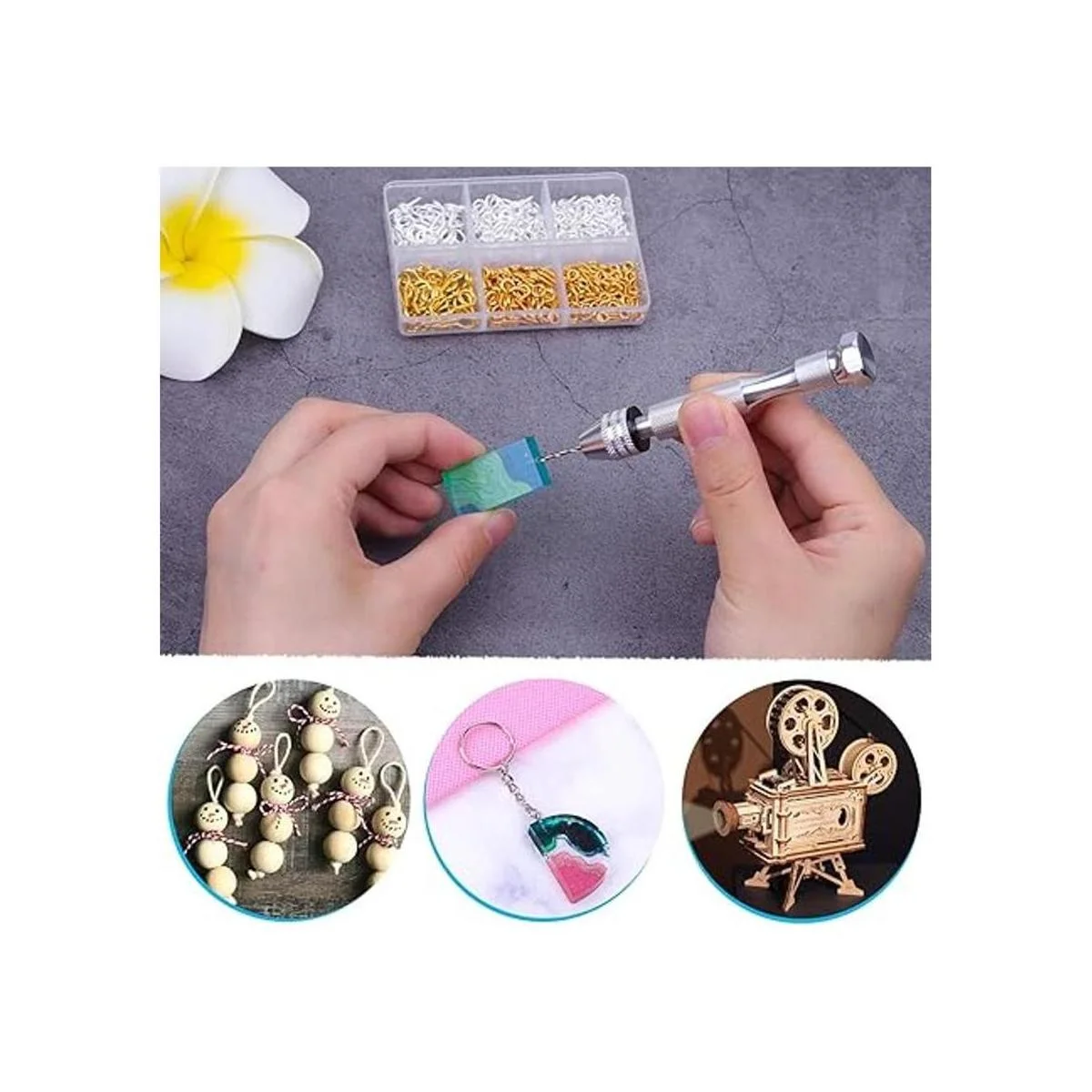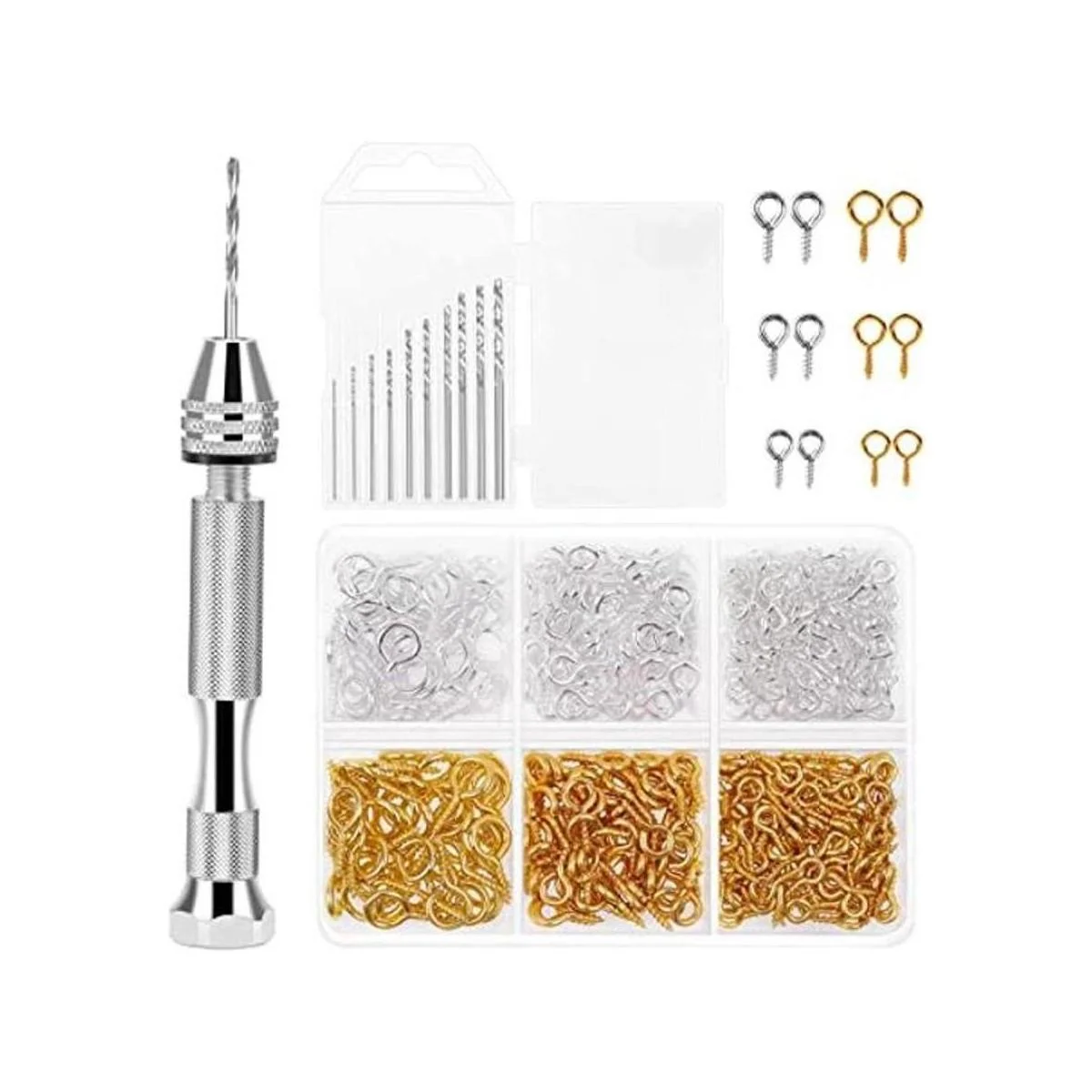 Tornillo de pasador para moldes de fundición de resina, taladro de mano Shynek para fabricación de joyas, herramientas de resina incluye 1 taladro de mano de empuje, 10 brocas de 480 tornillos de ojo para llavero de bricolaje dorado plata