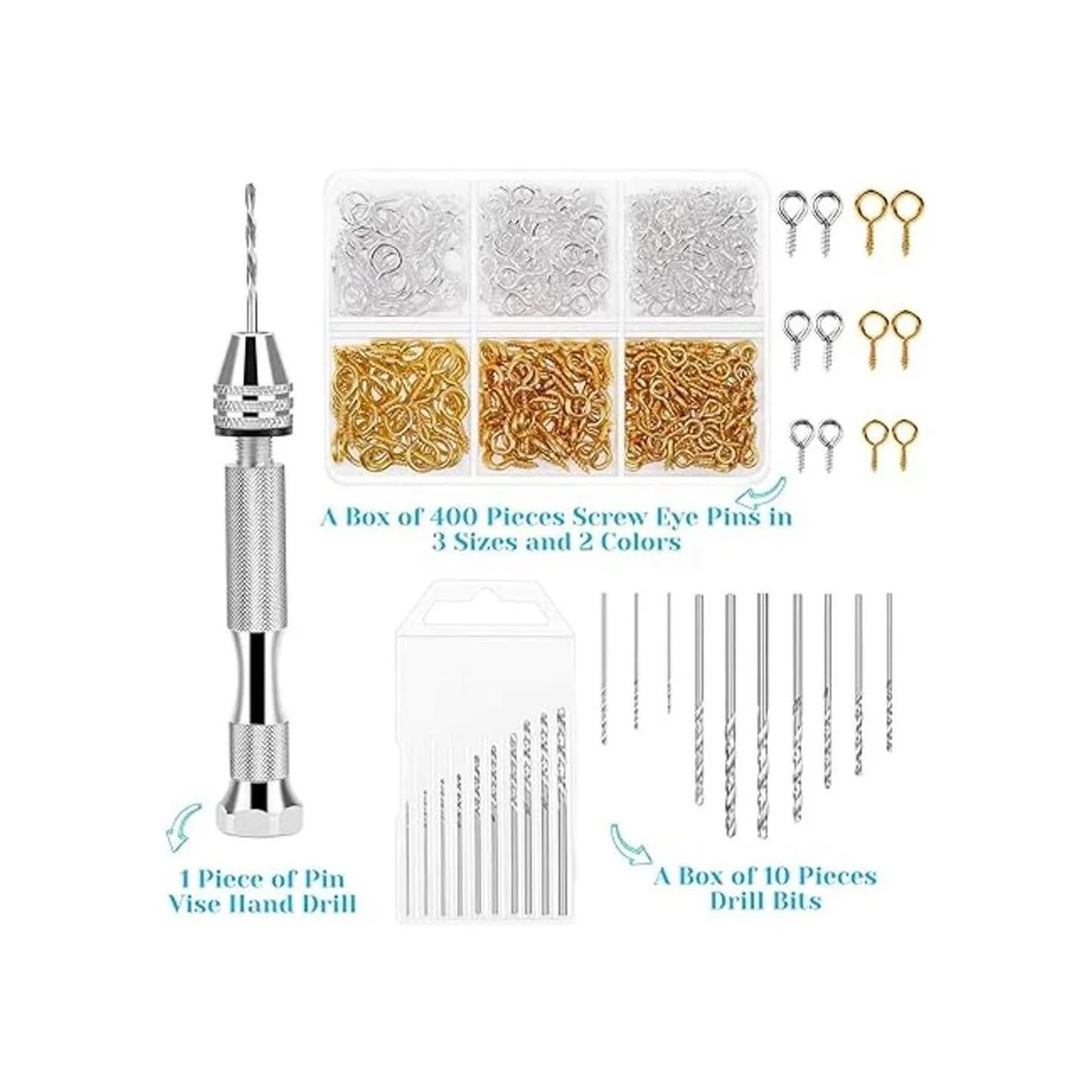 Taladro de mano para hacer joyas: el juego de herramientas de resina Shynek viene con una pieza de tornillo de banco de acero inoxidable, 10 brocas de tornillo de banco y 400 ganchos de ojo en varios tamaños, ideal para fundición de resina, fabricación de joyas, fabricación de llaveros y otras manualidades
