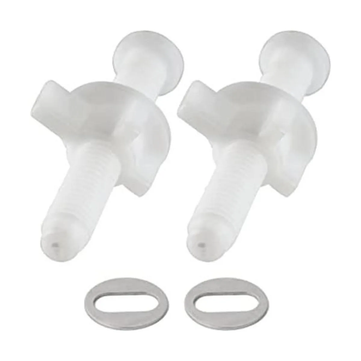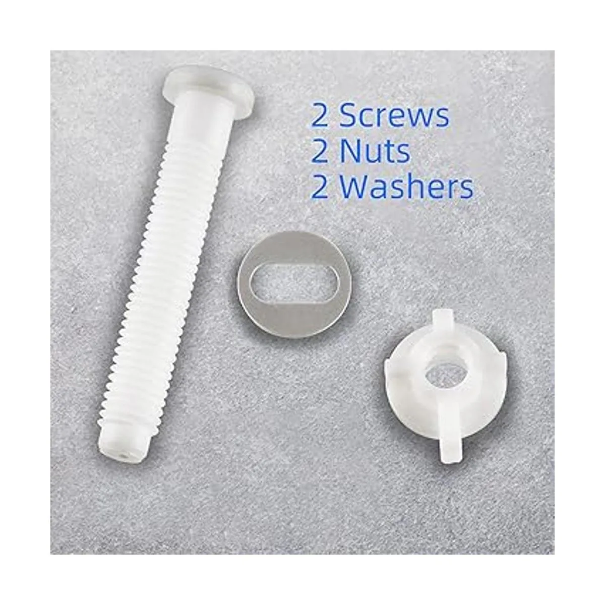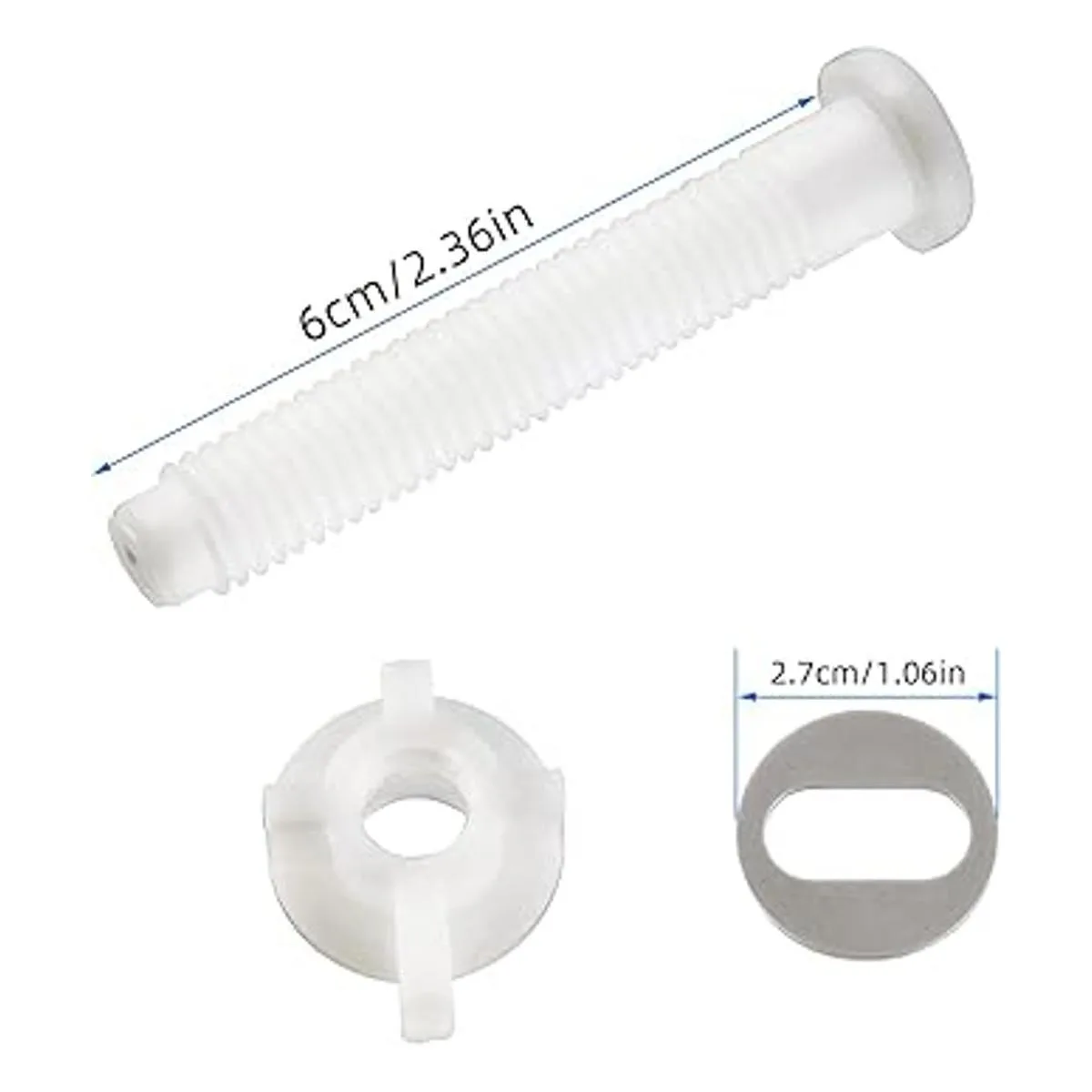 4. El paquete incluye: El tornillo de bisagra de asiento de inodoro de plástico blanco incluye tornillo de asiento de inodoro de 2.4 in paquete de 2, tuercas de plástico de 1.1 in paquete de 2 y arandelas de acero inoxidable de 1.1 in paquete de 2