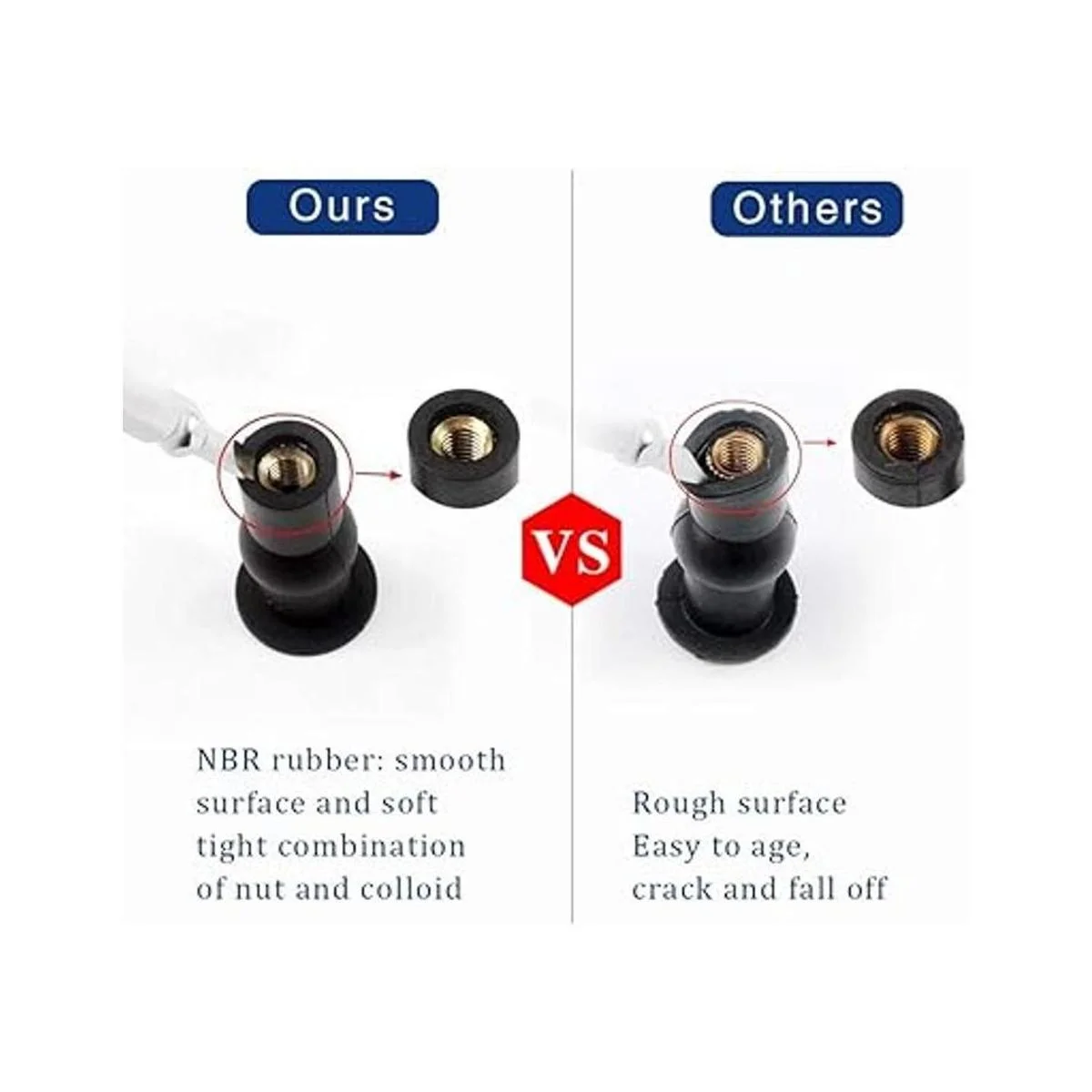 Los ojales de goma en el kit tienen una sección roscada para que puedas simplemente empujarlos en los agujeros de la parte superior del inodoro y cuando aprietes el tornillo se expande y se aprieta en el agujero, sin la necesidad de un perno en el otro extremo del tornillo.