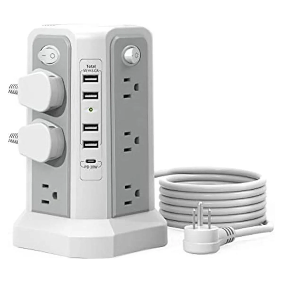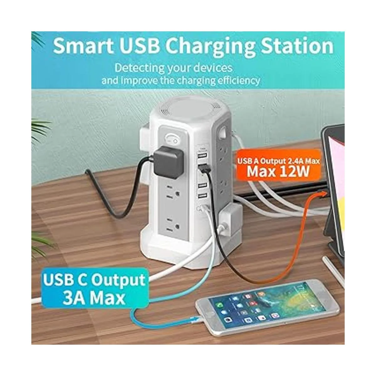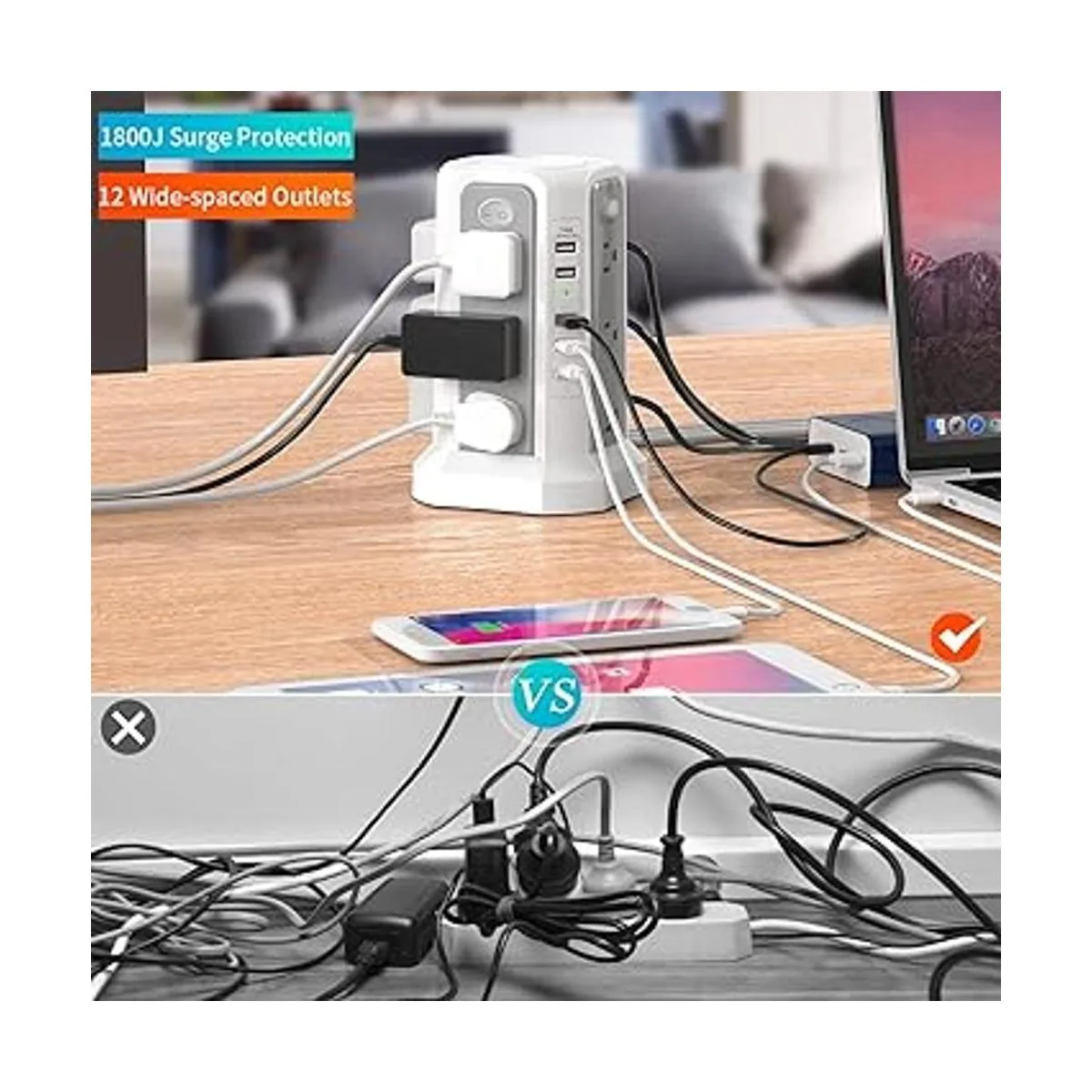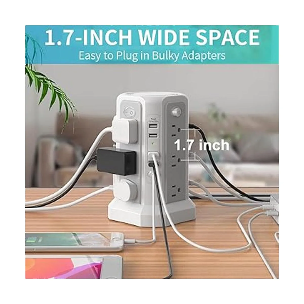 Regleta de protección contra sobretensiones de torre 17 en 1 con USB: Esta torre vertical de protección contra sobretensiones con 12 salidas de CA paso de 1.7 pulgadas y 5 puertos de carga USB 1 USB C USB A: máximo 2.4 A/puerto, USB C: 18 W máximo, 5 V/3 A, 9 V/2 A, 12 V/1.5 A, que puede alimentar múltiples dispositivos. Como PC, computadoras, portátiles, teléfonos, tabletas, TV, impresoras, altavoces, smartphone, reloj inteligente y otros suministros de oficina.