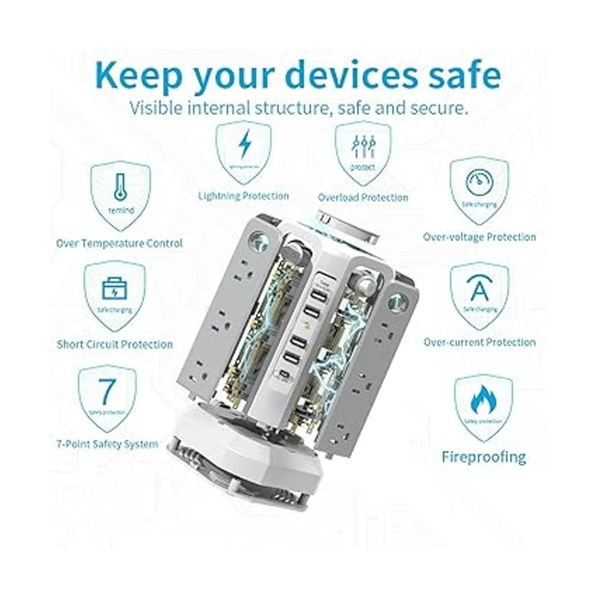 Protección contra sobretensiones de 1800 julios y protección contra sobrecarga: este protector de sobretensiones con protección contra sobrecarga protege contra picos y fluctuaciones. Esta torre de regleta tiene protección contra sobrecarga, protección contra cortocircuitos, protección contra sobrecorriente, protección contra sobretensión, protección contra sobretemperatura, producción de sobretensiones y protección contra rayos. Cortará automáticamente la energía para proteger los dispositivos conectados cuando la sobretensión de voltaje sea abrumadora.