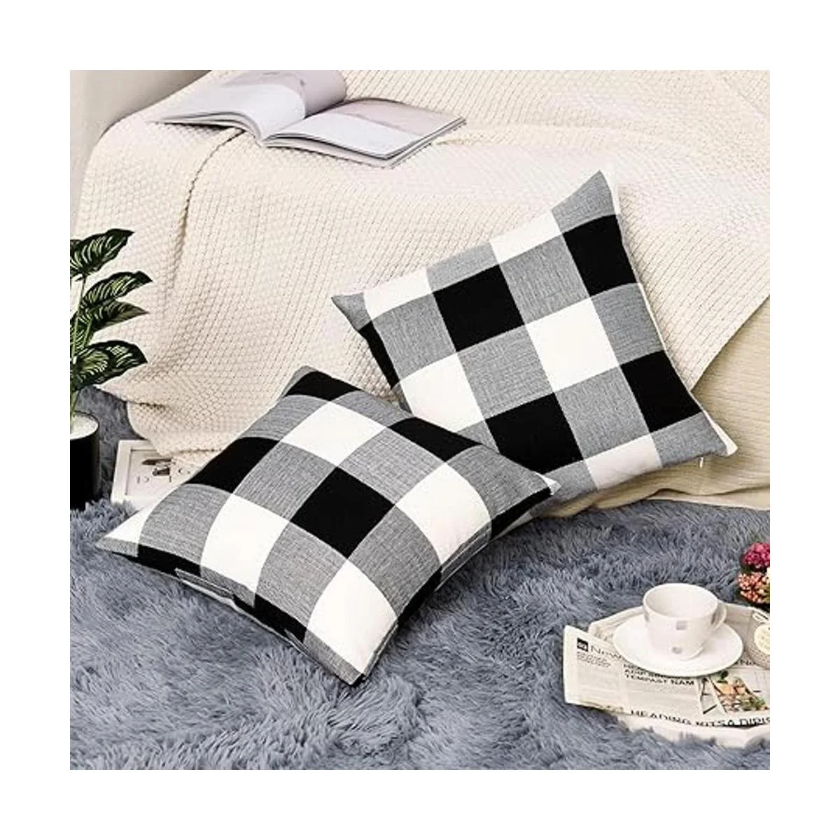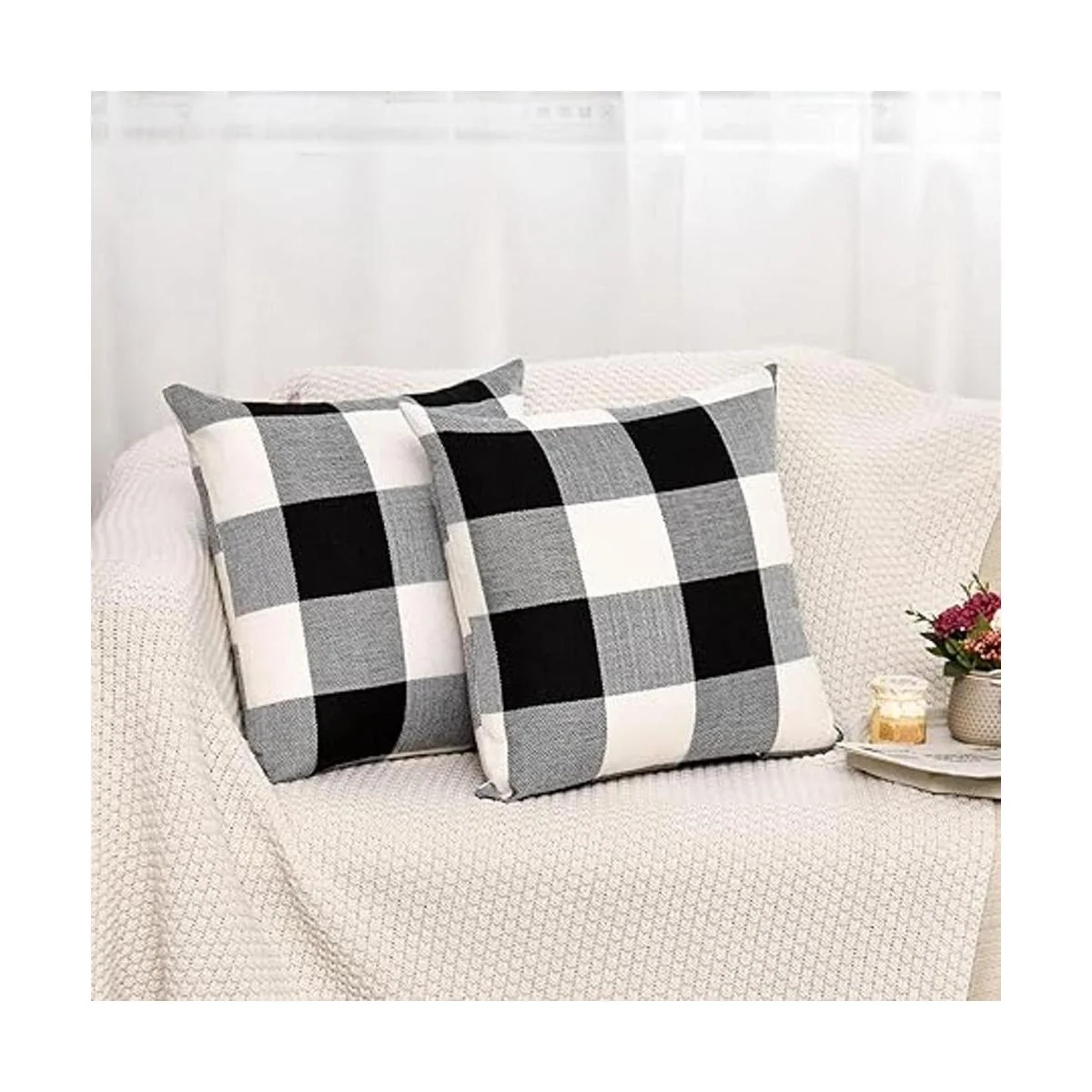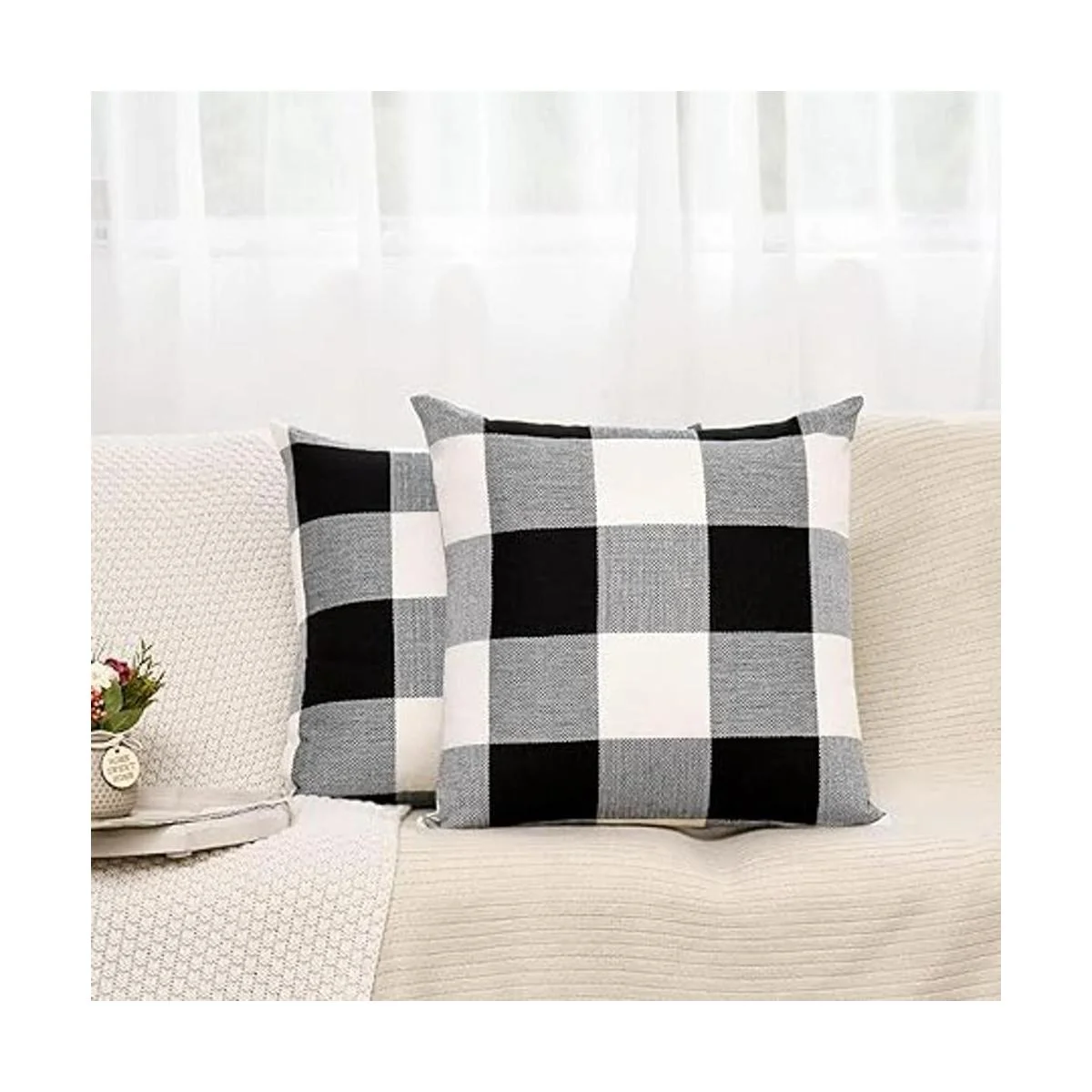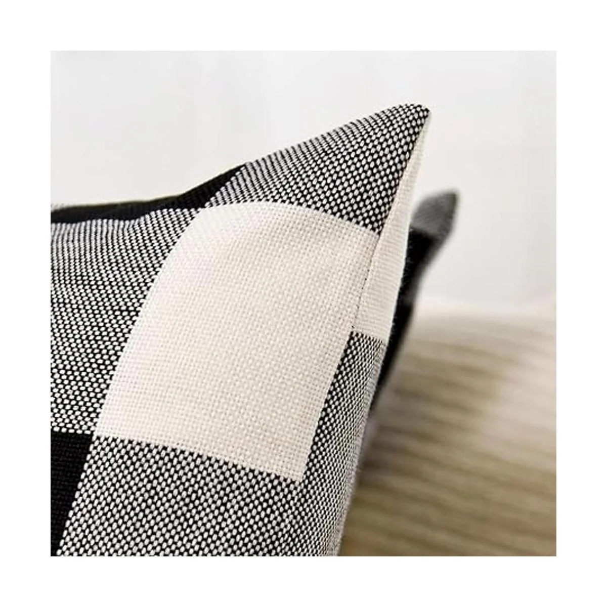 Material duradero: hecho de material de tela de lino de algodón grueso duradero. Fundas de almohada a cuadros de búfalo blanco y negro.
