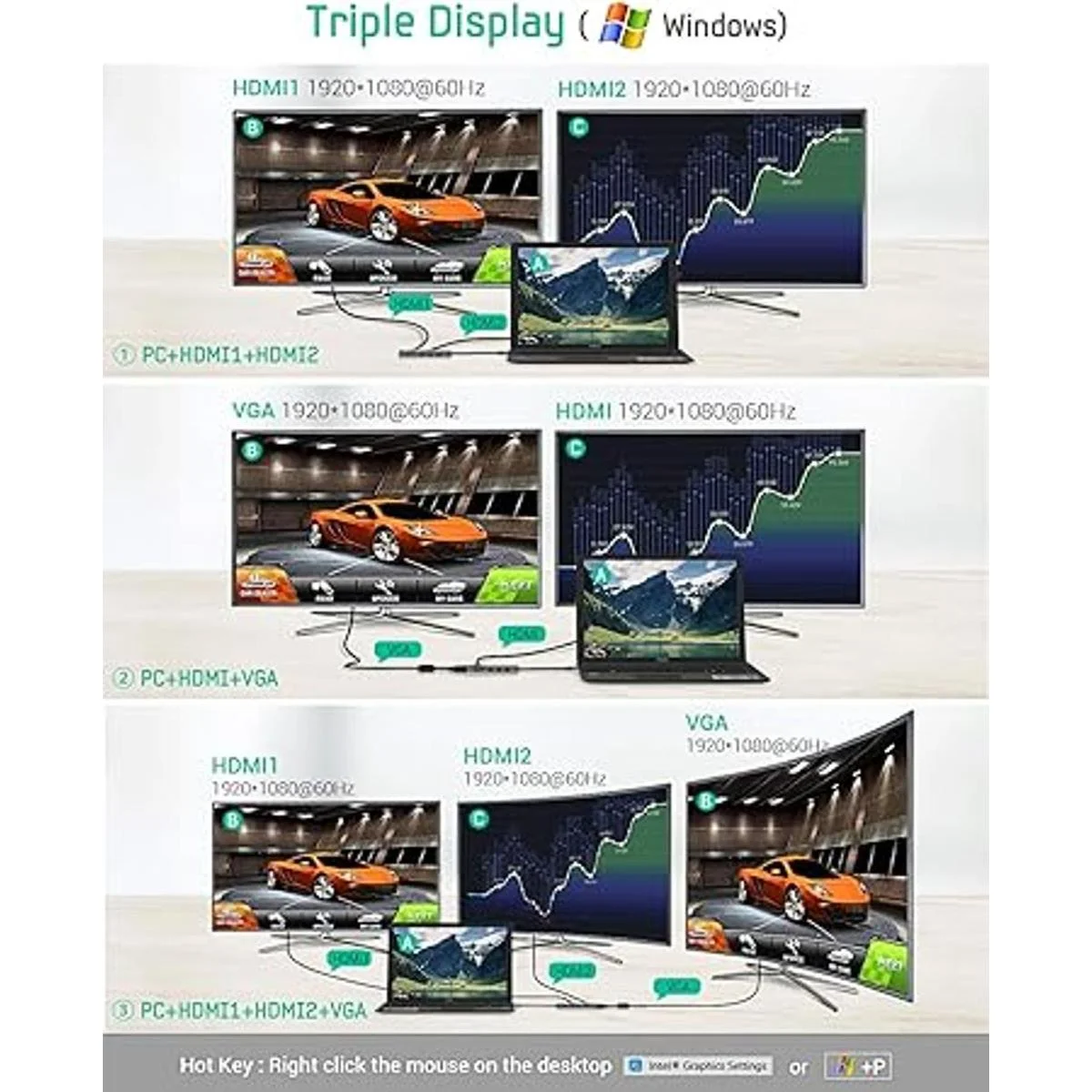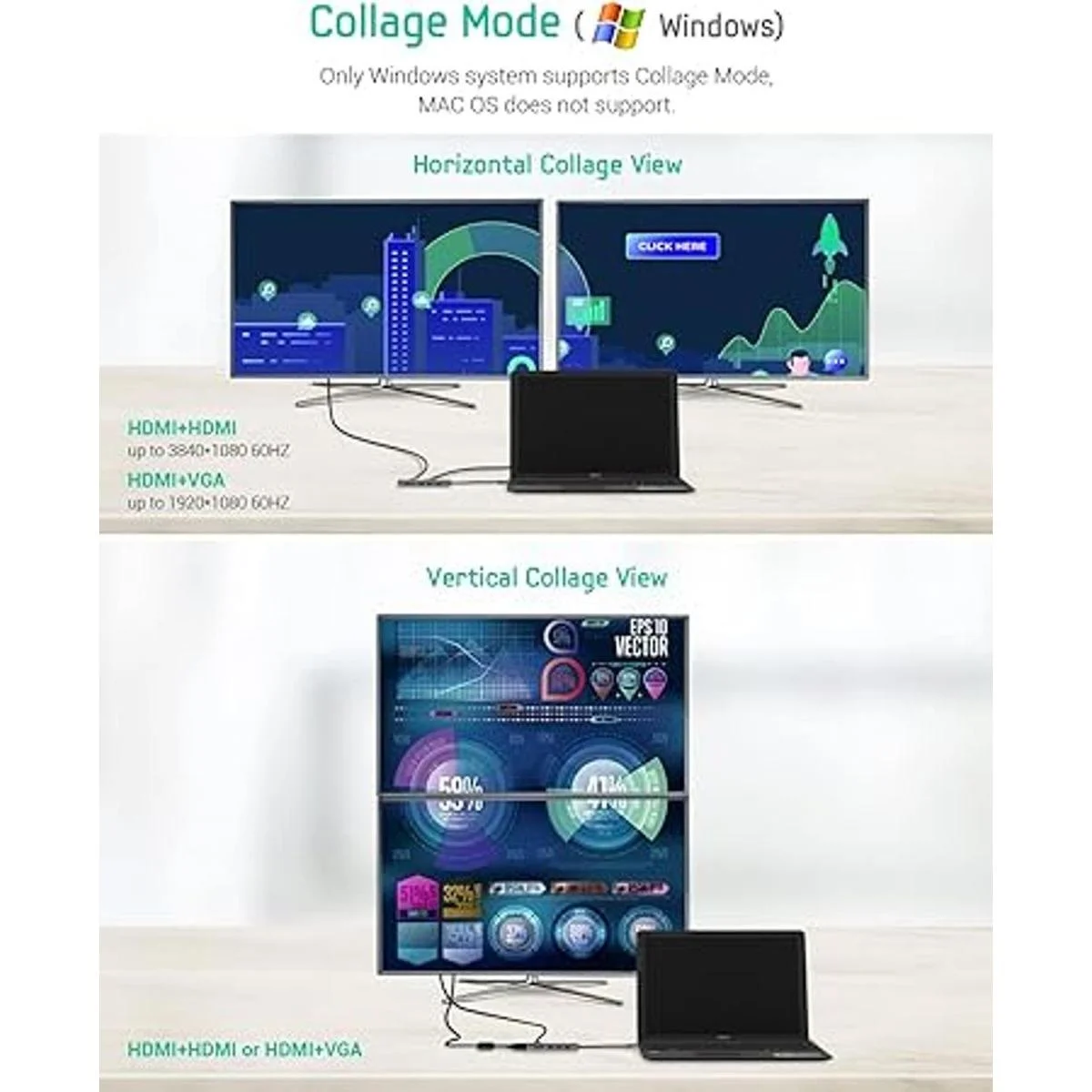 Salida UHD 4K y pantalla múltiple: espejo, extiende o collage tu pantalla es implementable ahora, lo que te da una experiencia visual sin precedentes. Puedes transmitir directamente tus pantallas a HDTV, monitor o proyector fácilmente, aumenta altamente tu eficiencia de trabajo. Soporta una pantalla HDMI dual de hasta 3840 x 2160 30 Hz, o 1920 x 1080 60 Hz con VGA. Si quieres saber más sobre la resolución de cada puerto conectado, consulta la descripción del producto.