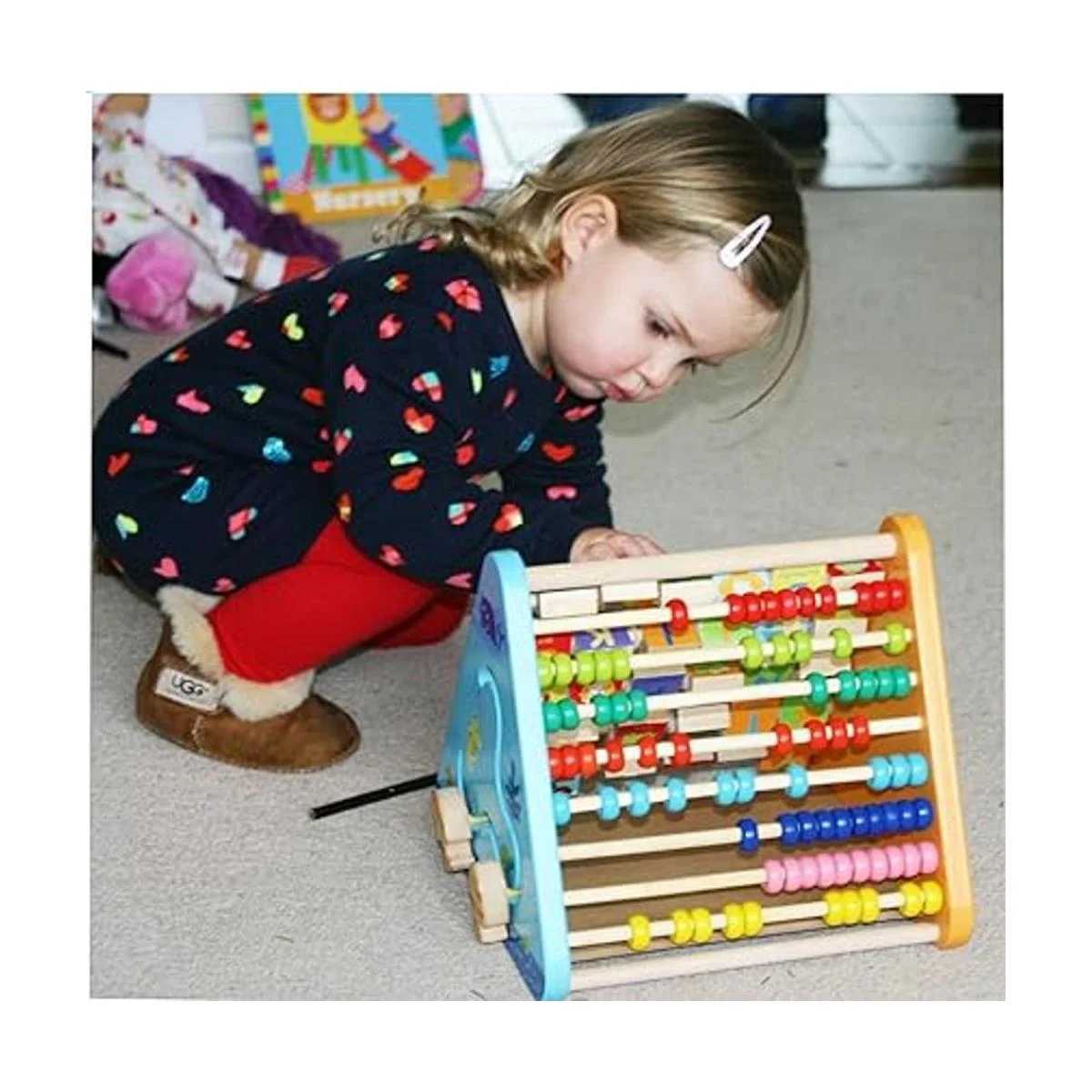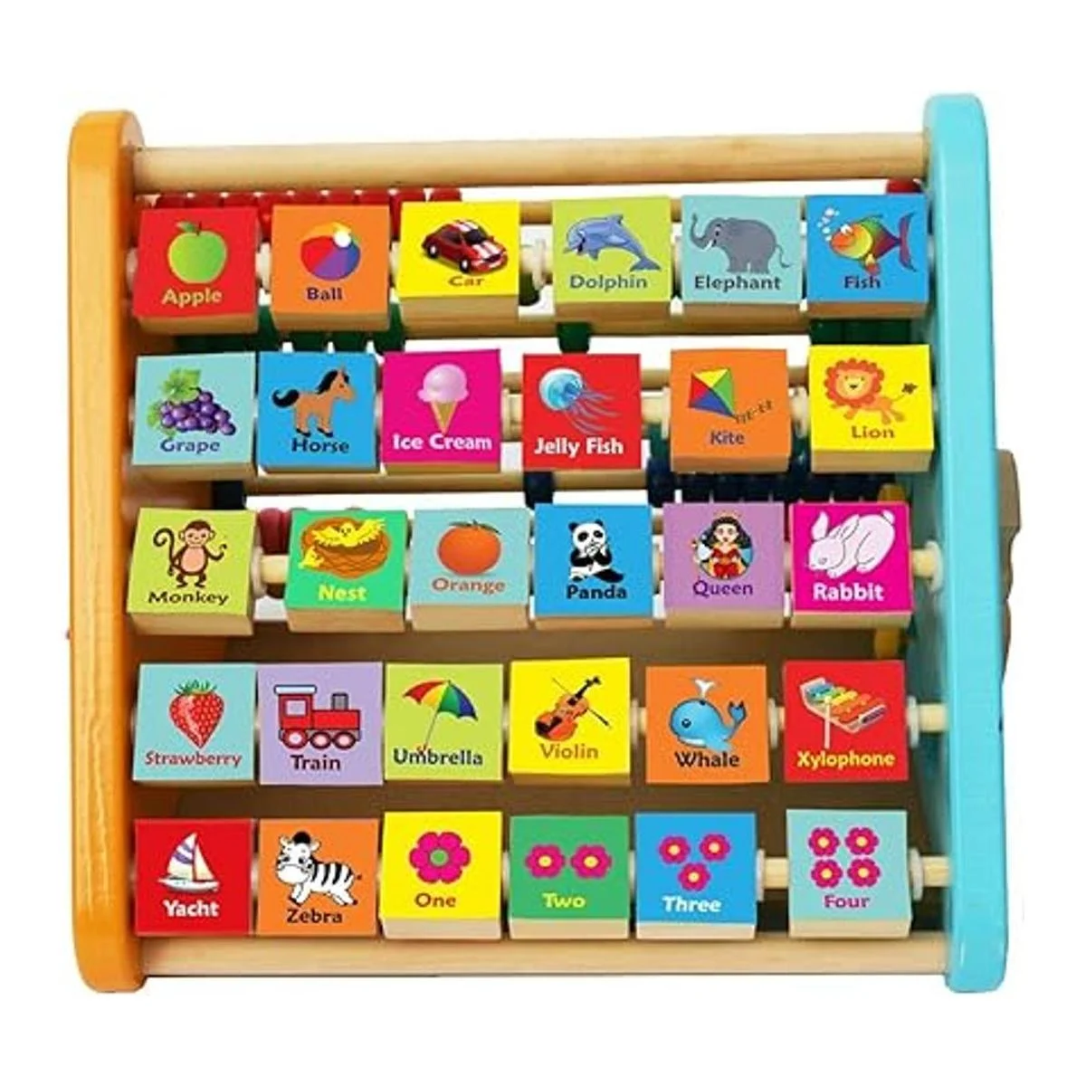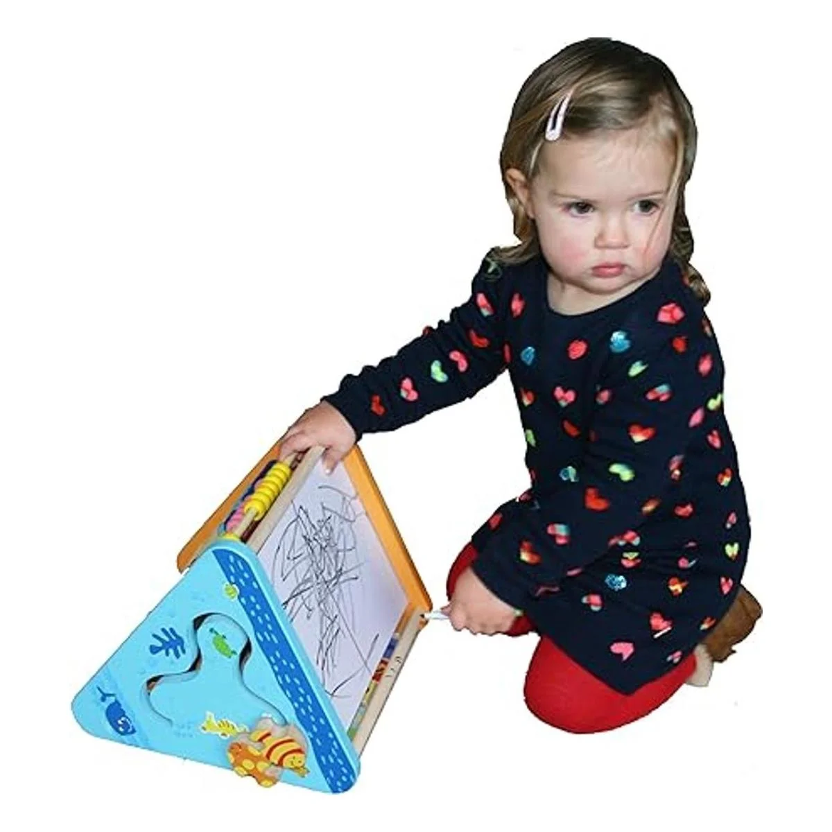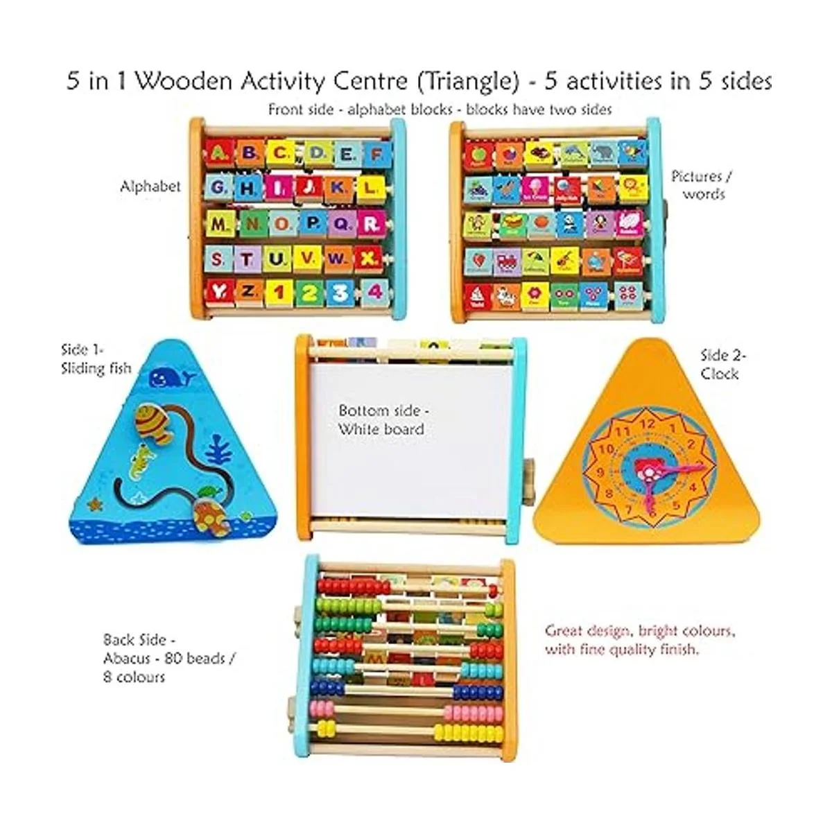 Triángulo multifuncional 5 en 1 con cubo de actividad de madera: Volteando 26 bloques de alfabeto y cuatro bloques de números con imágenes y palabras en inglés, ábaco, reloj, zigzag, peces deslizantes en 4 lados y pizarra blanca en la parte inferior. Uno de los mejores juguetes de madera para actividades para niños pequeños