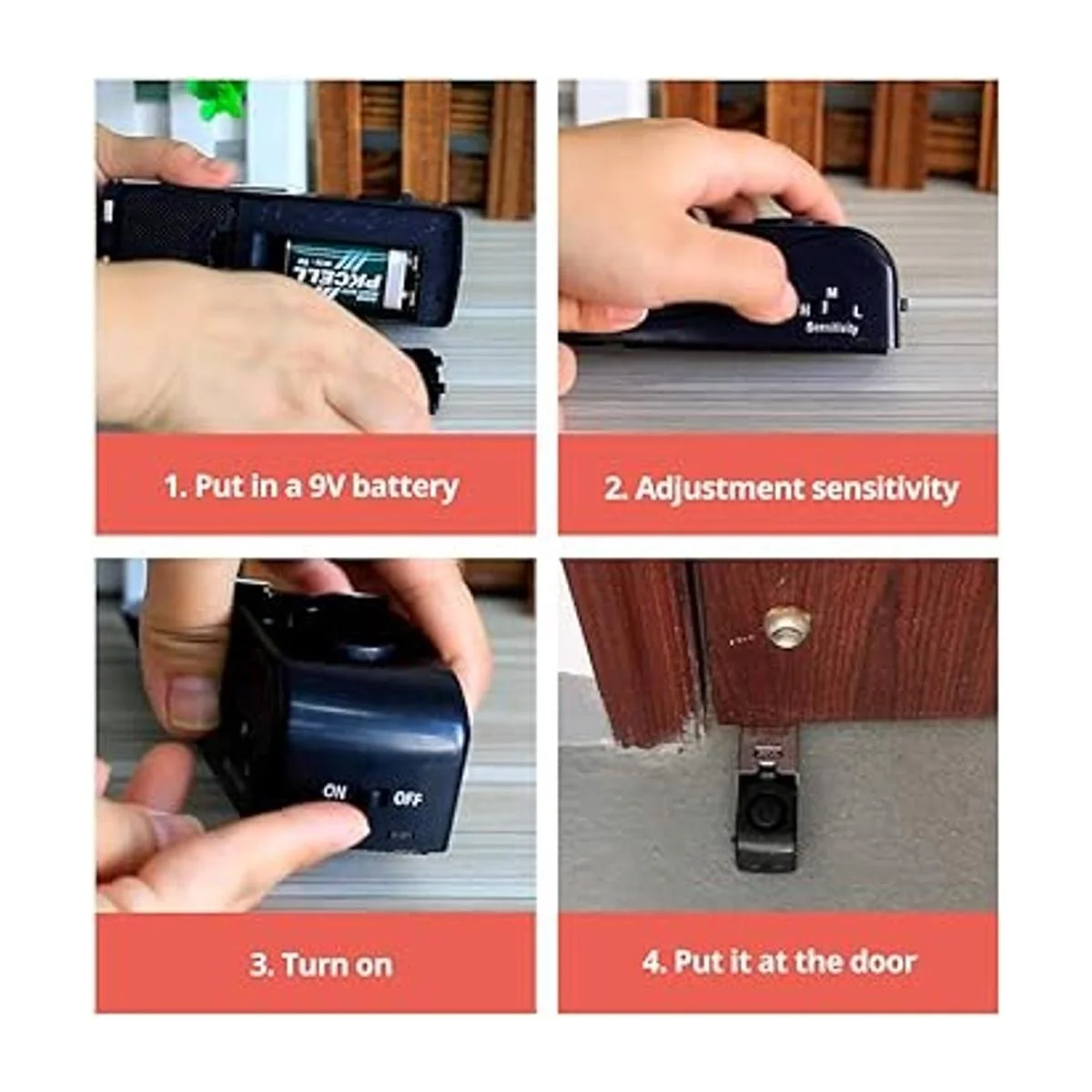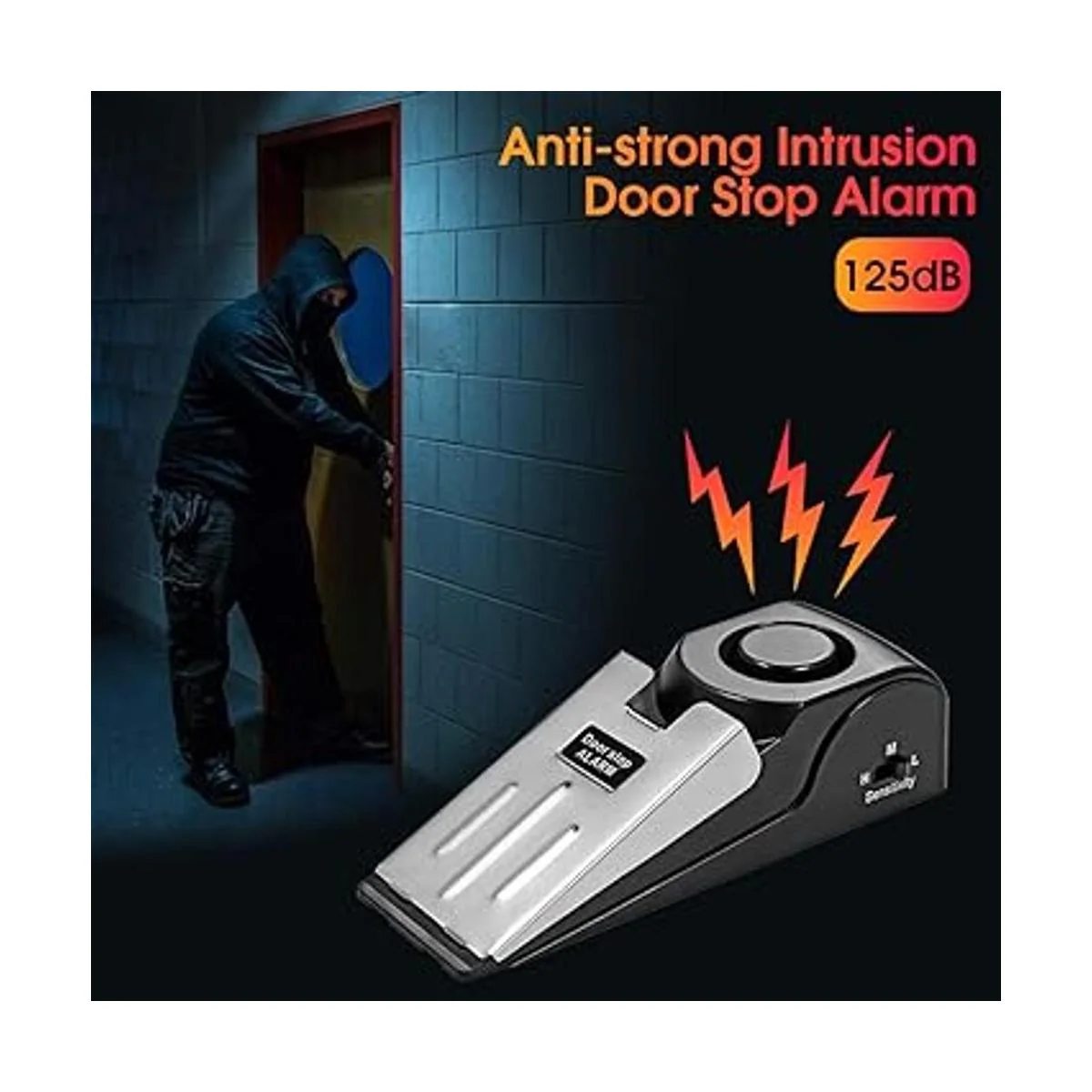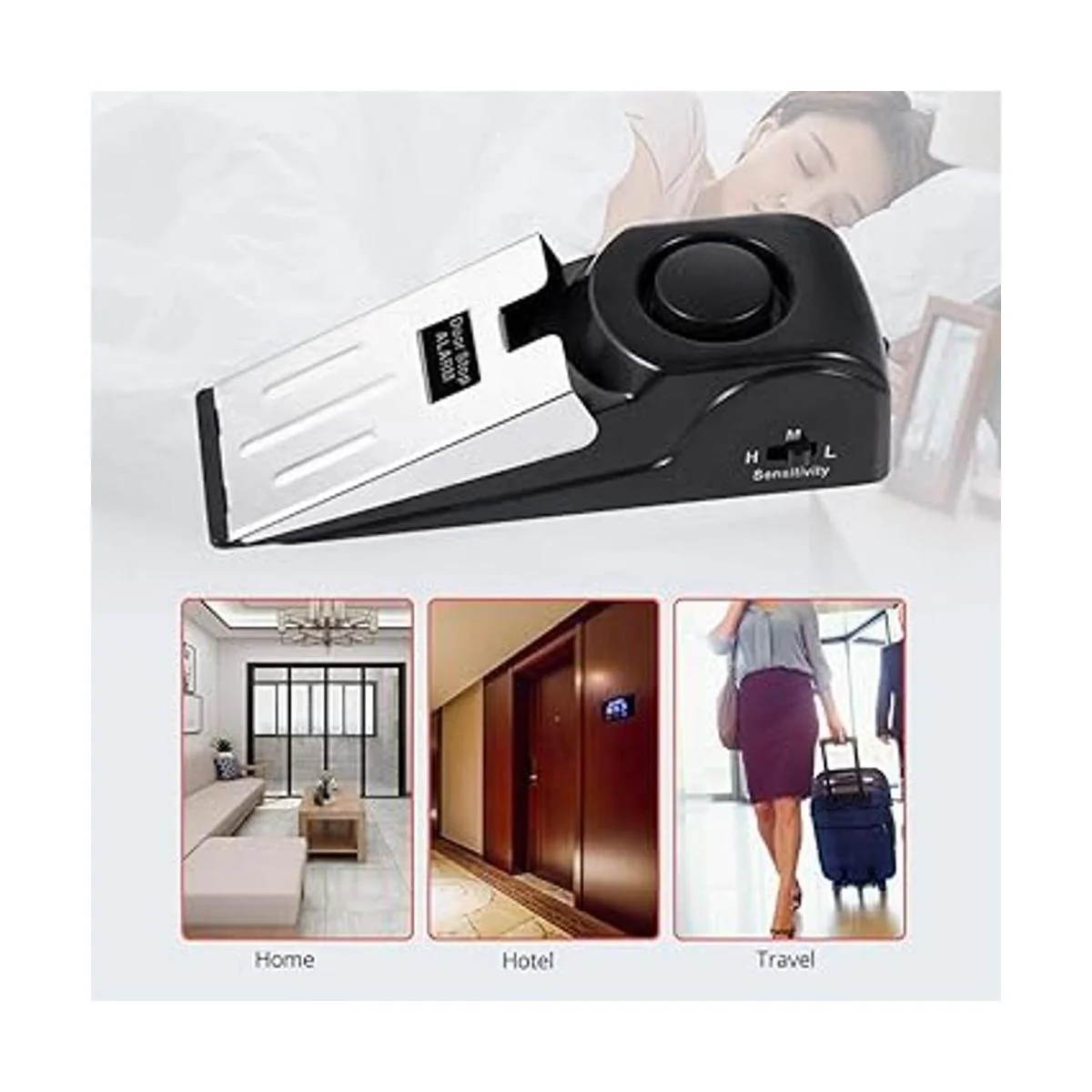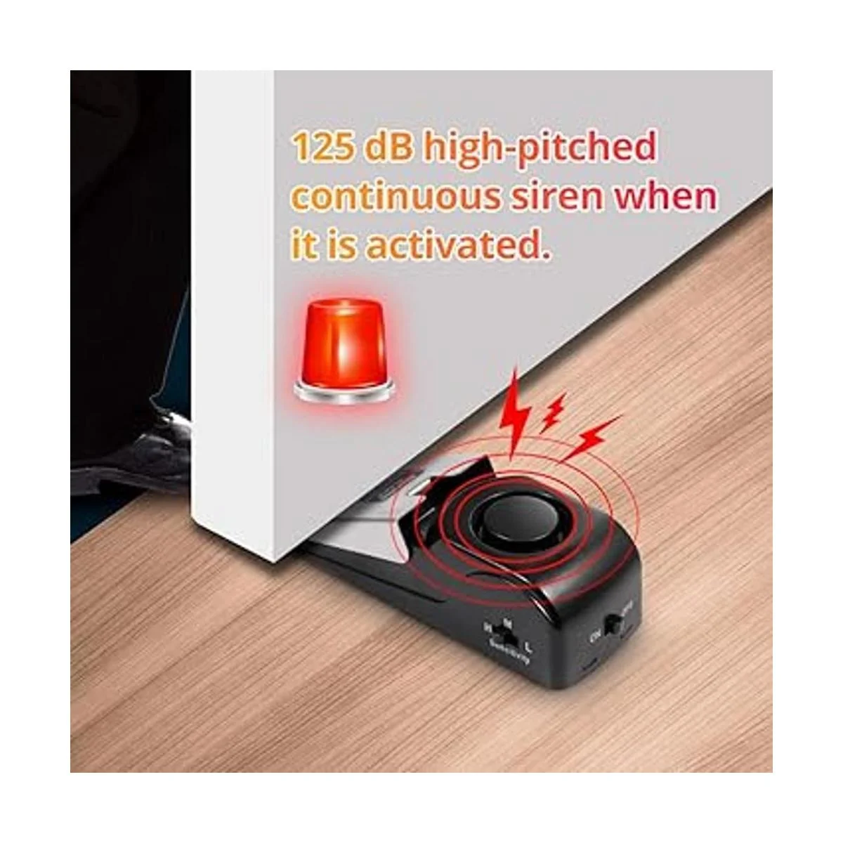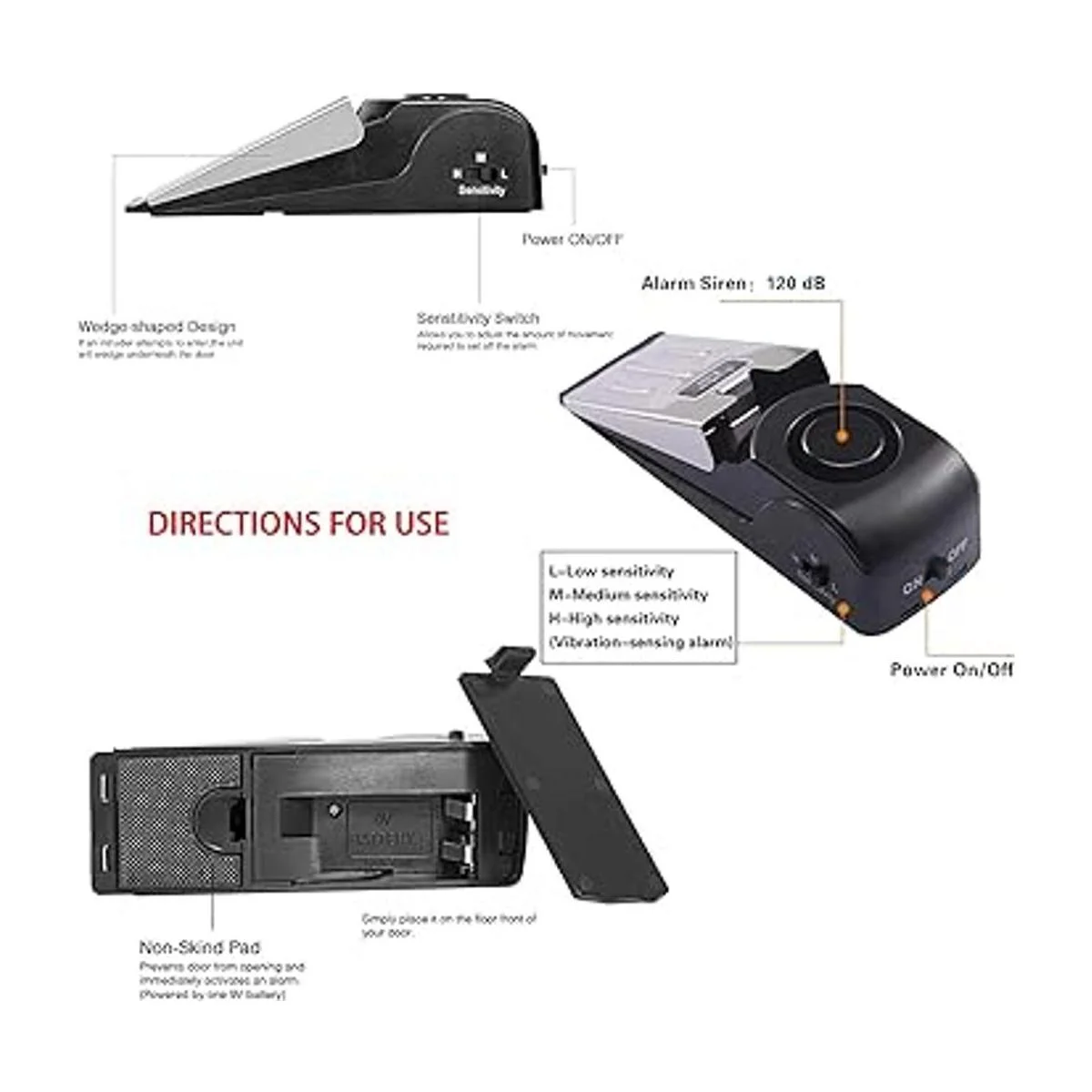 Tope de puerta antideslizante : la alarma de tope de puerta está en estado apagado, se puede utilizar como cuña de puerta de base de goma de amortiguación común, mantiene la puerta en posición abierta, sin ningún sonido de alarma fuerte. 3 niveles de sensibilidad: bajo, medio alto, con un interruptor de sensibilidad ajustable en el lateral; el nivel H es el nivel más sensible que la vibración activará una alarma