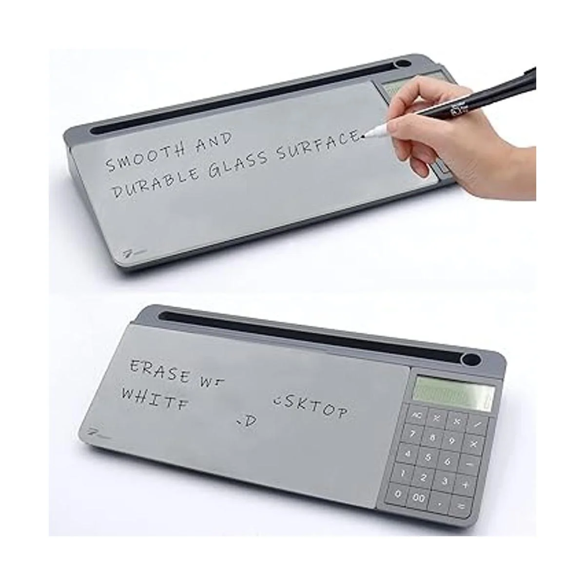 TOWON Pizarra blanca de vidrio de escritorio con calculadora básica, pantalla LCD de 12 dígitos, organizadores de escritorio con accesorios para oficina, hogar, suministros escolares, almacenamiento con superficie de pizarra de borrado en seco, gris, 18 x 6 pulgadas