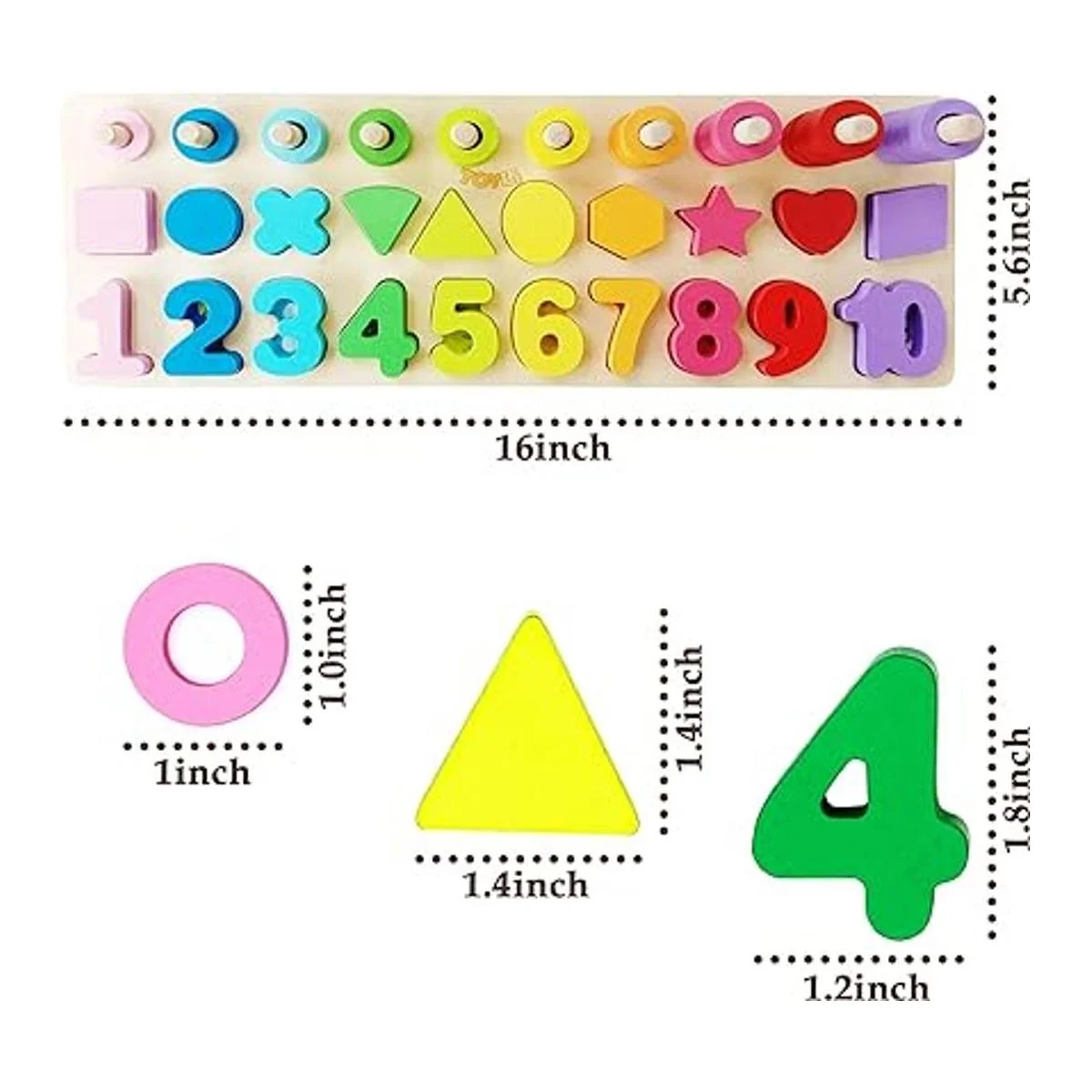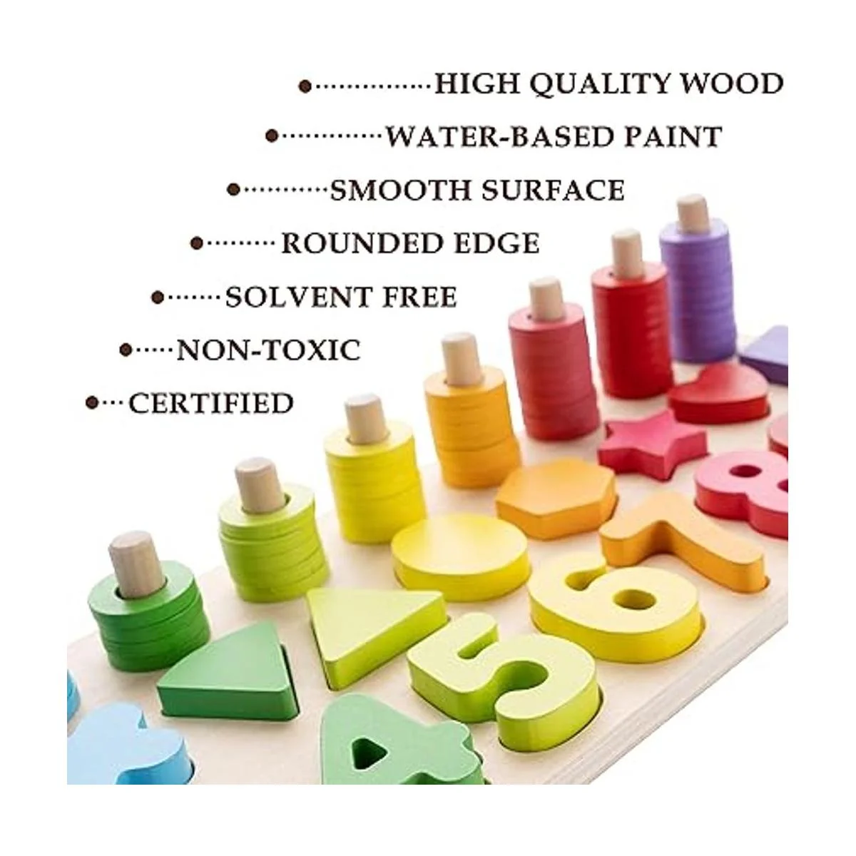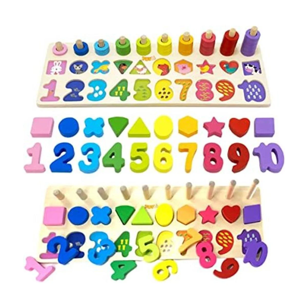 TOYLI Tablero educativo de aprendizaje de matemáticas y rompecabezas de madera 4 en 1 formas y números para niños pequeños Montessori contar y ordenar reconocimiento de formas apilables para niños y niñas, regalo para niños preescolares