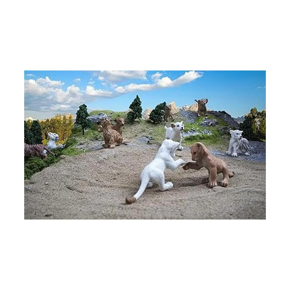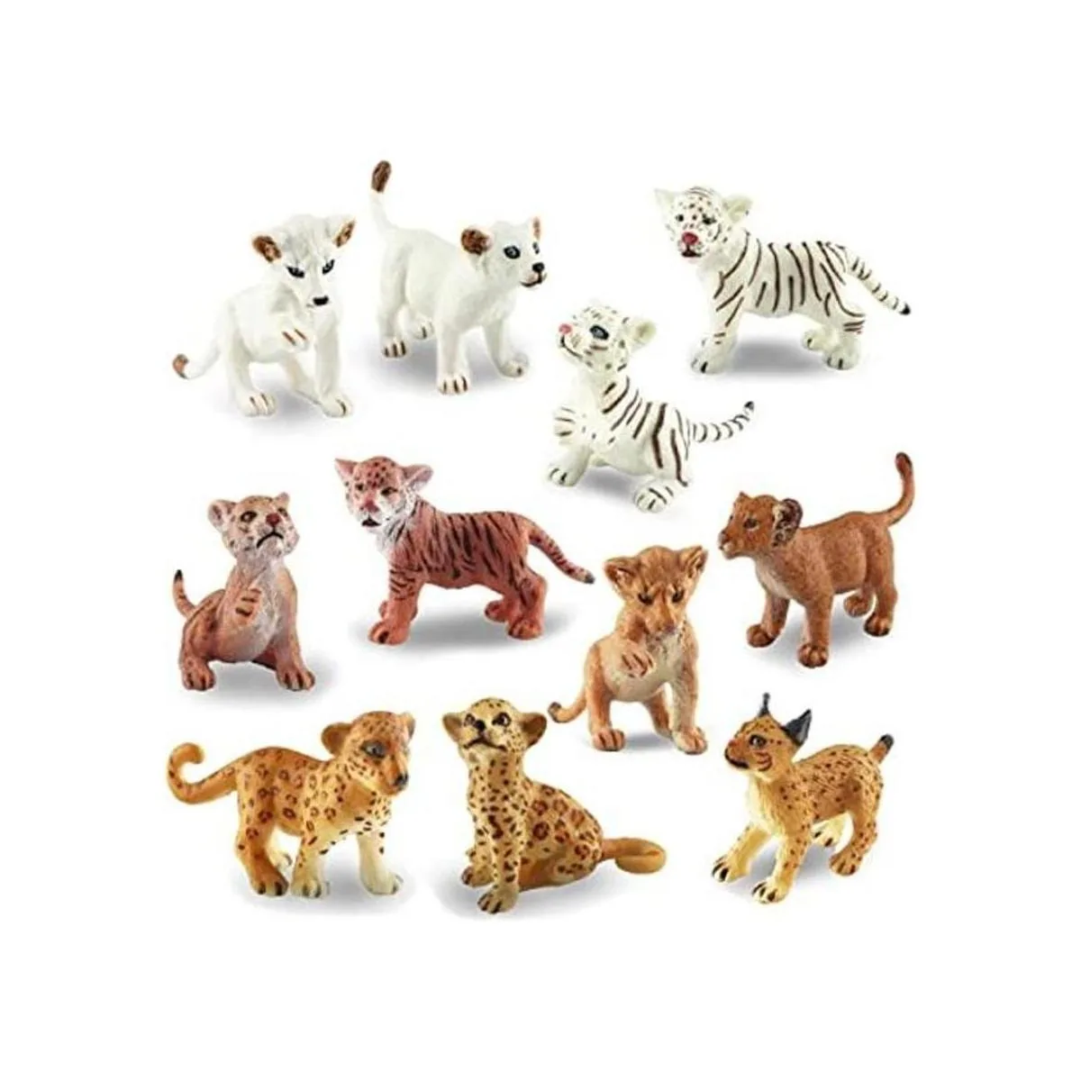 Juego de figuras de animales de safari: incluye 2 leones, 2 tigre, 2 guepardos, 2 leones blancos, 2 tigres blancos y 1 lince, 11 figuras de animales. De 2 a 2.7 pulgadas de longitud, cada figura mide aproximadamente 0.04 libras de peso. Es un regalo increíble y juguetes educativos para niños de 3 años en adelante.