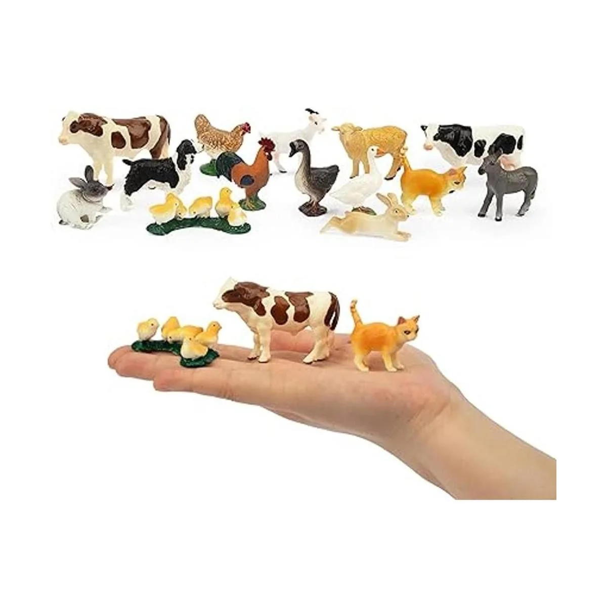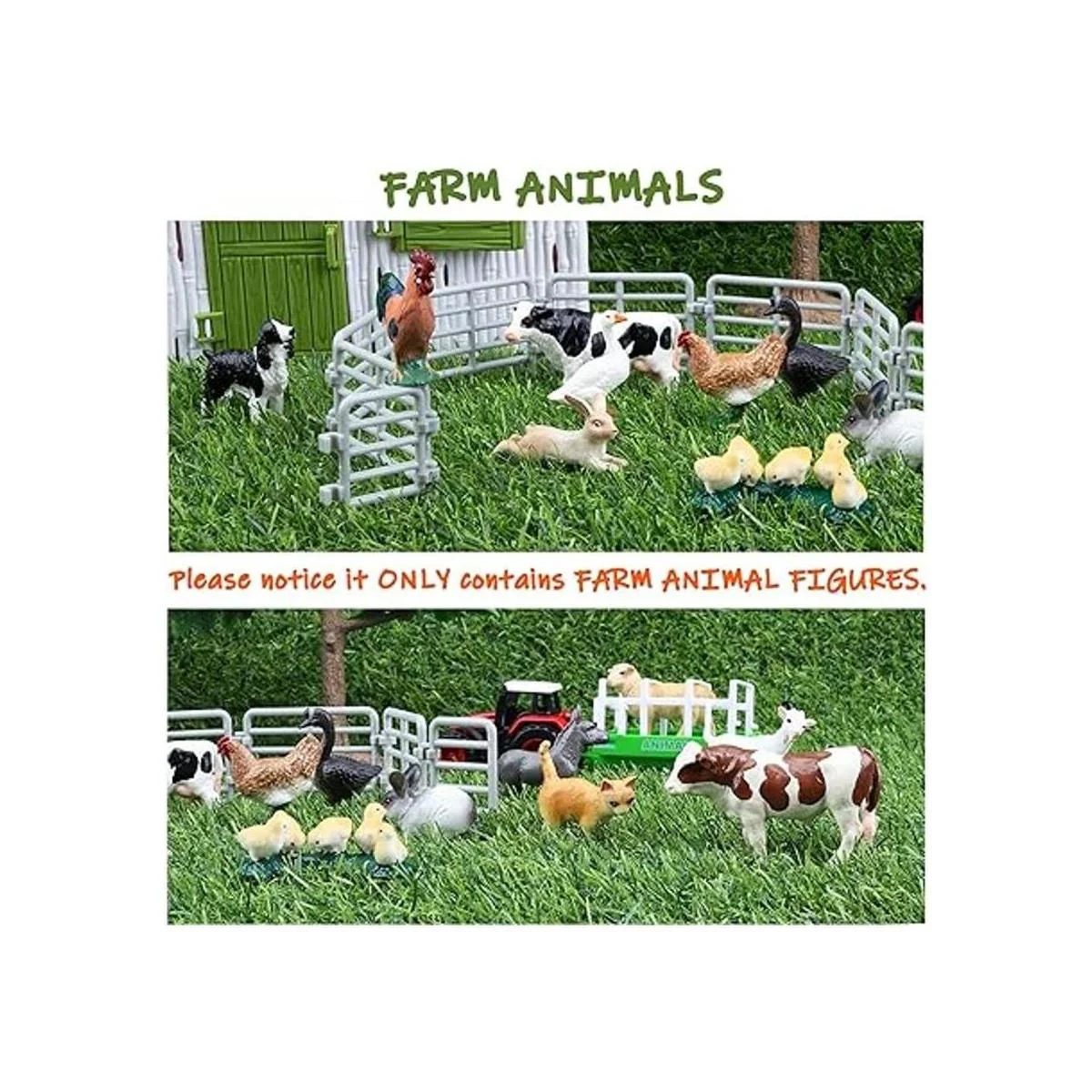 Mini figuras de animales de granja: incluye 1 cabra, 1 oveja, 1 pato, 1 ganso, 1 gallina, 1 fila de pollitos, 1 burro, 2 vacas, 2 conejos, 1 perro, 1 gato, 14 figuras de animales de granja.