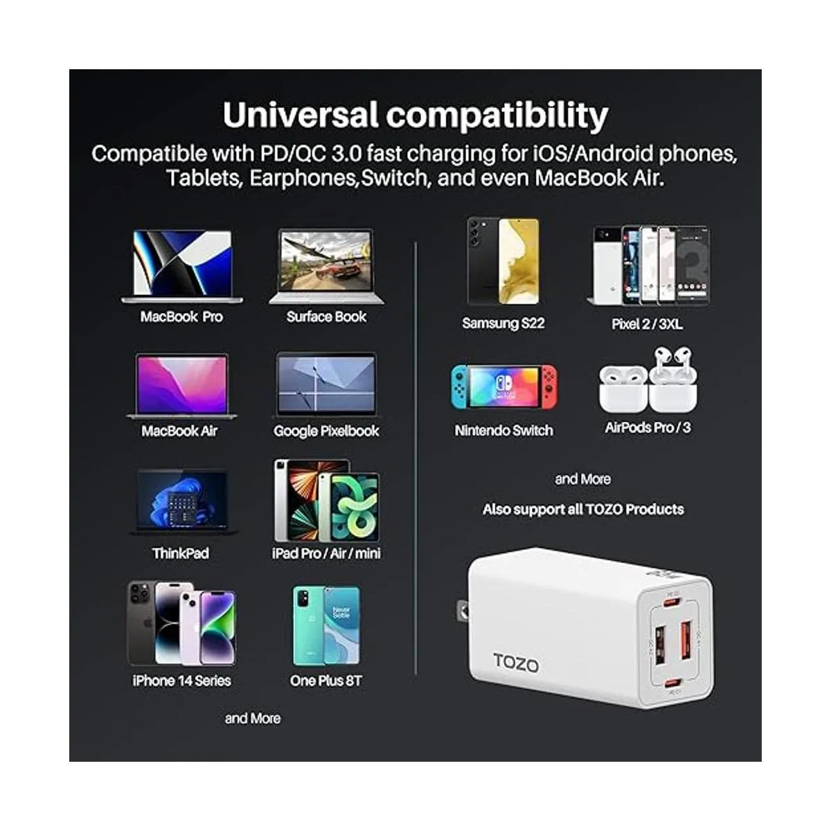 Altamente compatible: el cargador es compatible con Steam Deck/Laptops/Tablets/iPhone 14/14 Pro/14 Pro Max/13/12/Mini/Pro/Pro Max/XS/XS Max/XR/X/11/11 Pro/11 Pro max/8 Plus/8/7/6; Samsung Galaxy S Series/Note Series; LG V60/V50/G8. /G7; Google Serie Pixel; MacBook Air; MacBook Pro/MacBook/iPad Pro; iPad Series Airpods/Airpods Pro; Surface Pro 7/HP Stream 14/Omen 17/Envy 13t/Spectre x360 13t; Dell Latitude 7380/XPS 13/16; ASUS ROG zephyrus G14/Zenbook13/14/15/flip 15/TUF A15/Vivobook 14/15/17