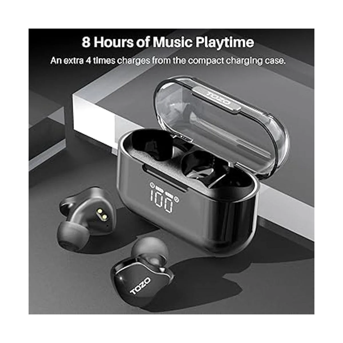 Larga resistencia Los capullos de cristal TOZO soportan carga inalámbrica. Los auriculares con una carga completa pueden alcanzar 7.5 horas mientras escuchas un 50; con caja de carga de batería grande, los auriculares y la caja de carga pueden lograr una resistencia total de más de 30 horas.