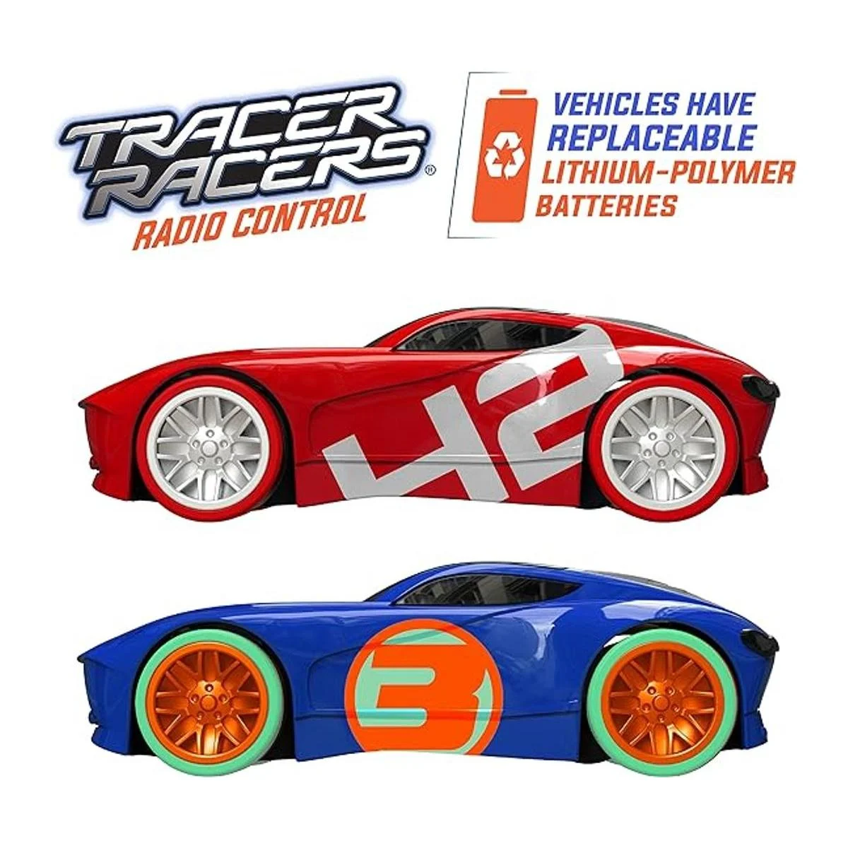 Tracer Racer racing cars feature undercarriage lights that not only make these cars look almost like they are hovering rather than rolling the lights also leave glowing streaks in their wake showing how the racers are burning up the track