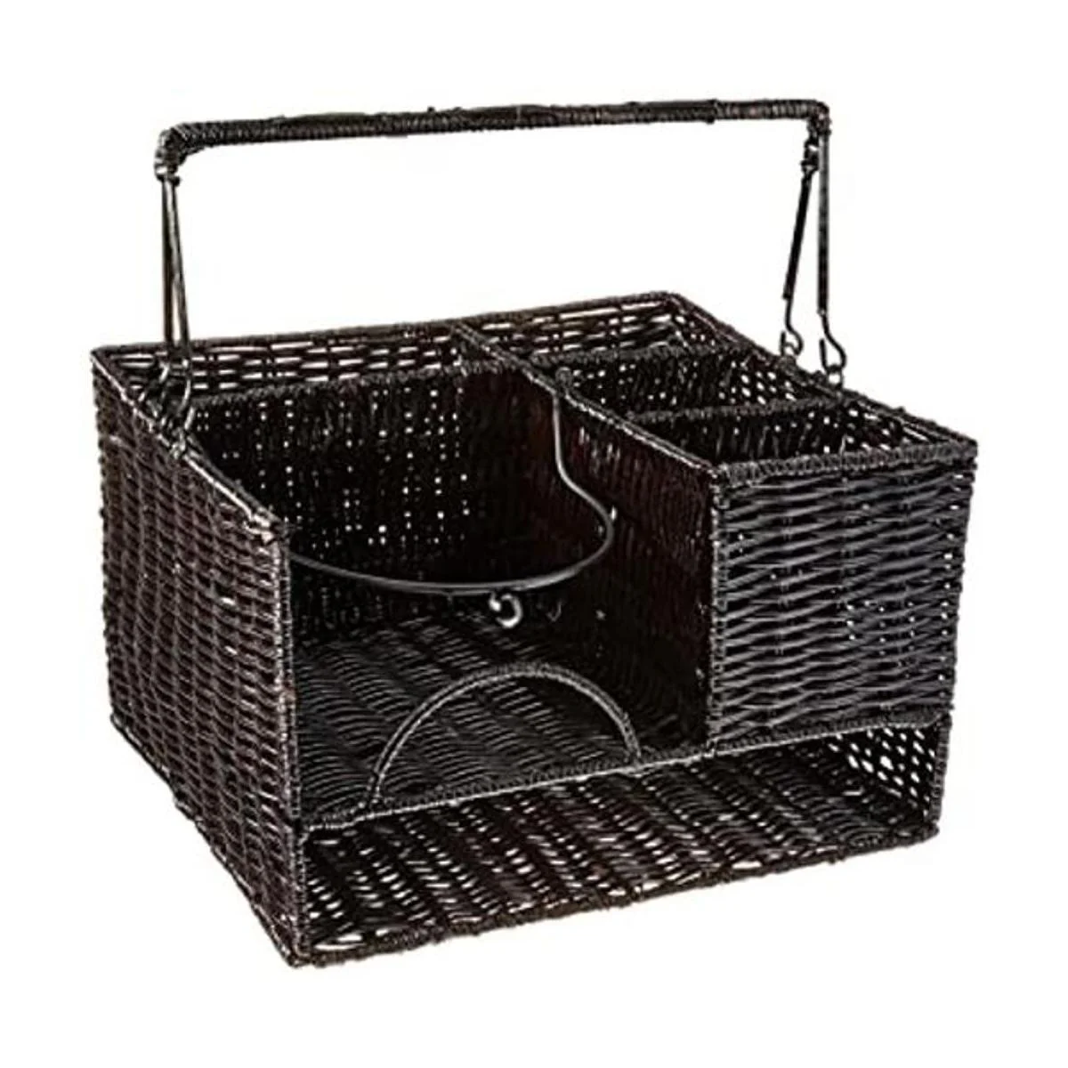 Hecho de ratán y sostiene convenientemente servilletas, utensilios, platos y condimentos