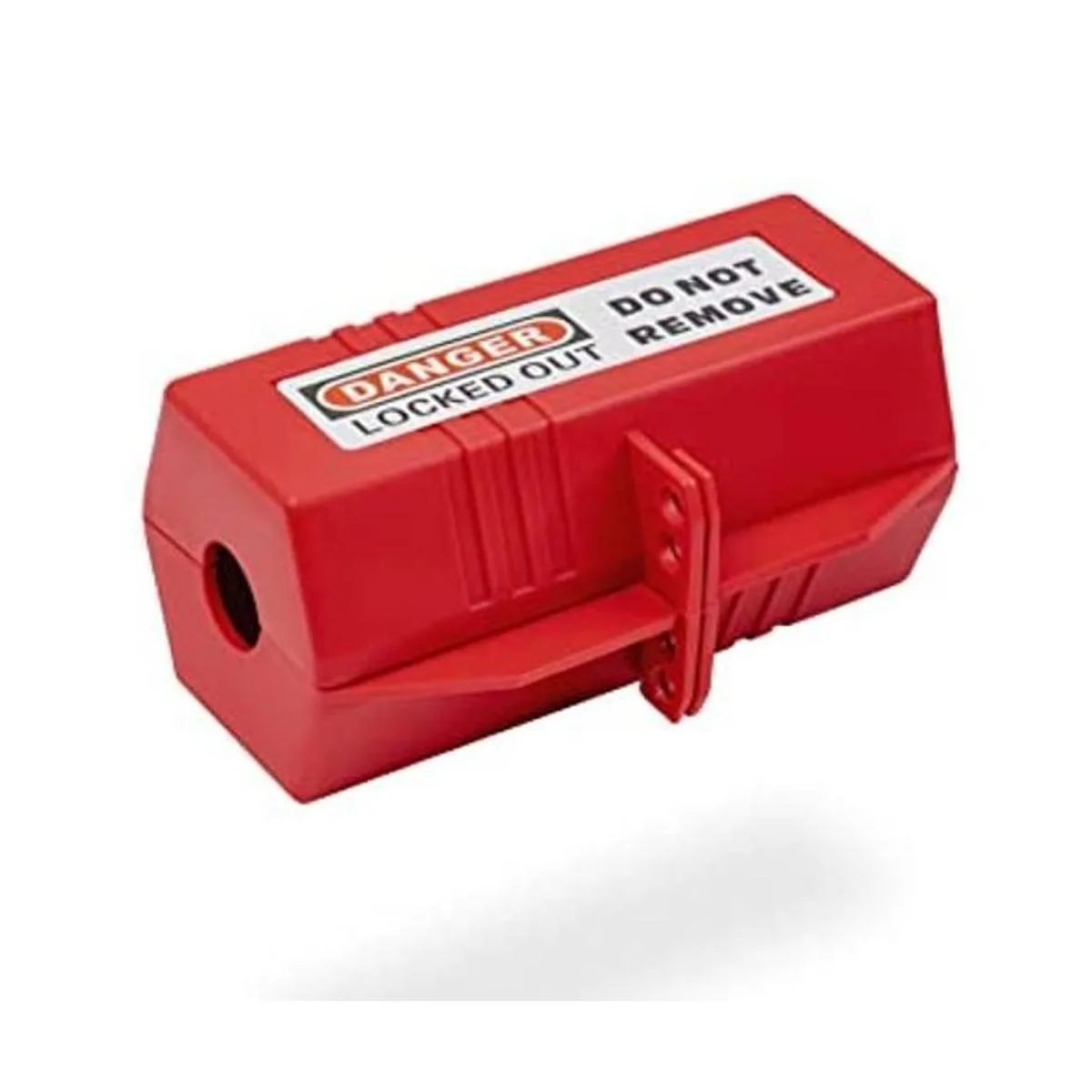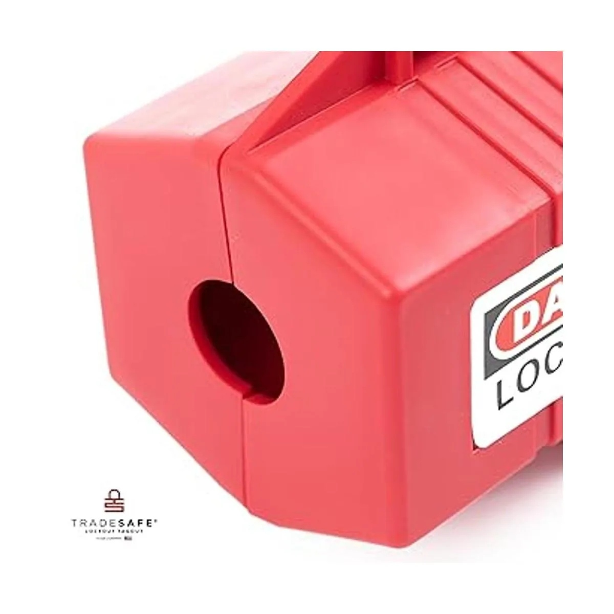Altamente visible: vibrante cuerpo de bloqueo de enchufe hexagonal rojo con una etiqueta de peligro para advertir vívidamente a las personas que el enchufe está bloqueado actualmente