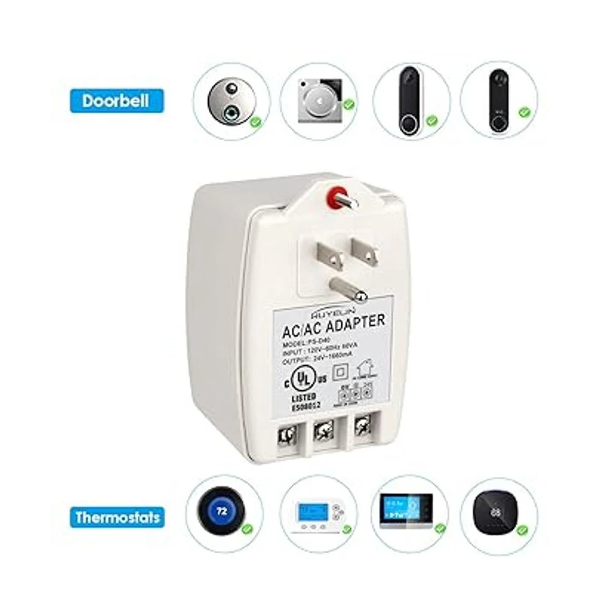 Solución de potencia para timbre/termostato: transformador de pared de 24 V CA 40 VA, utilizando este transformador para reemplazar y actualizar el transformador de potencia insuficiente, puede proporcionar suficiente energía para tu termostato y timbre, ahorra el problema de reemplazo frecuente de la batería