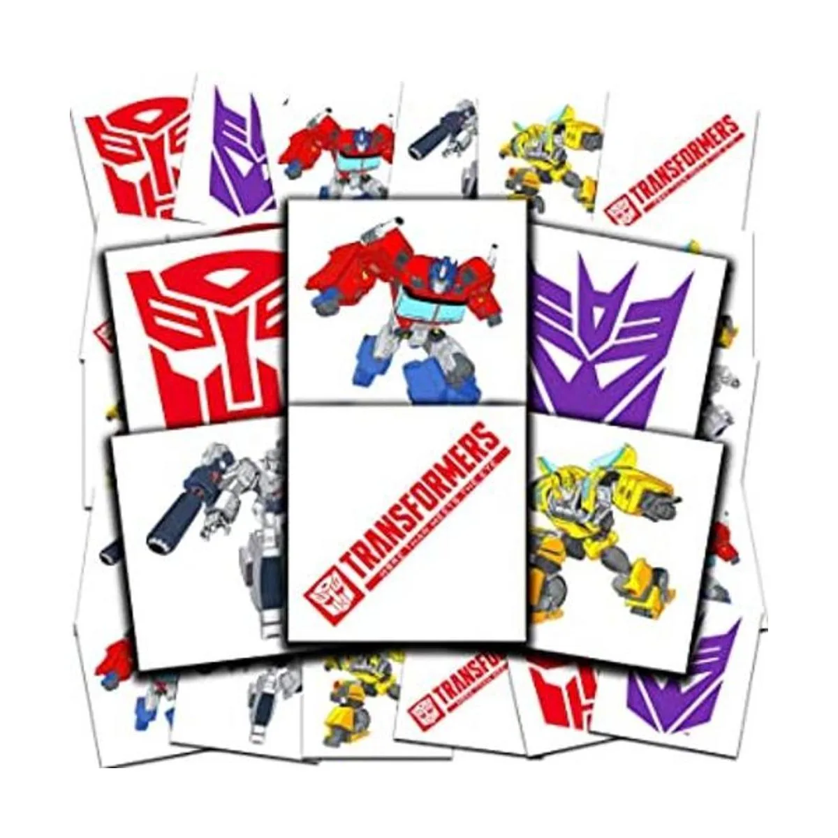 Paquete de 72 tatuajes temporales individuales de Transformers, precortados para mayor comodidad. Cada tatuaje mide 2 x 2 pulgadas.