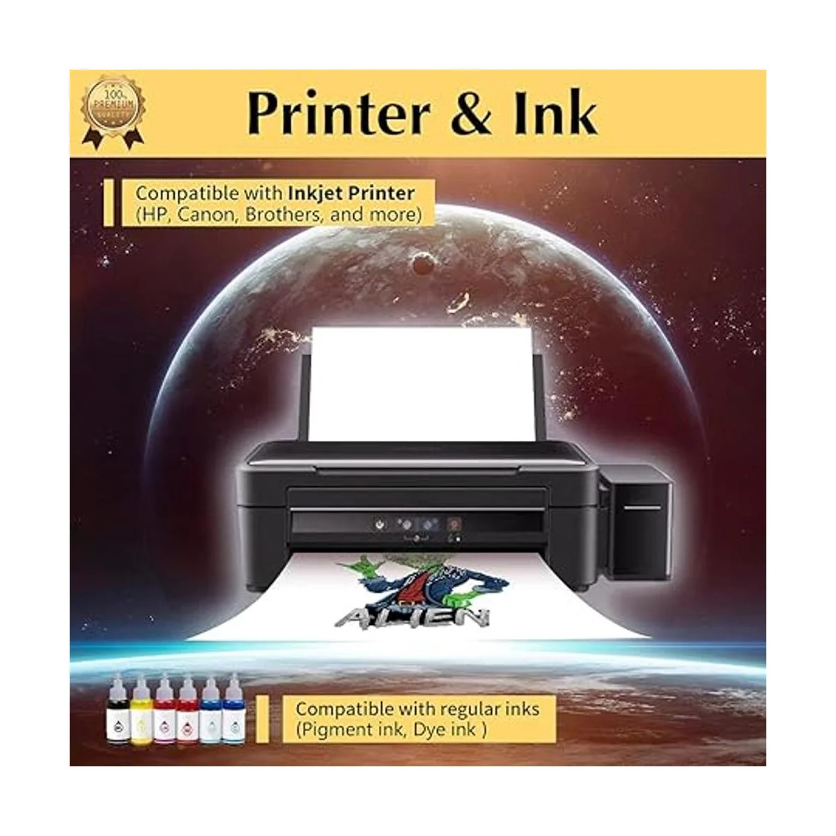 Requisitos: Impresoras de inyección de tinta como HP, Brother, Canon y otras marcas Tinta pigmentada o tinta de tinte Tijeras o máquina de corte Cricut, Silhouette y más. Máquina de plancha o prensa de calor Papel de teflón incluido en el paquete.