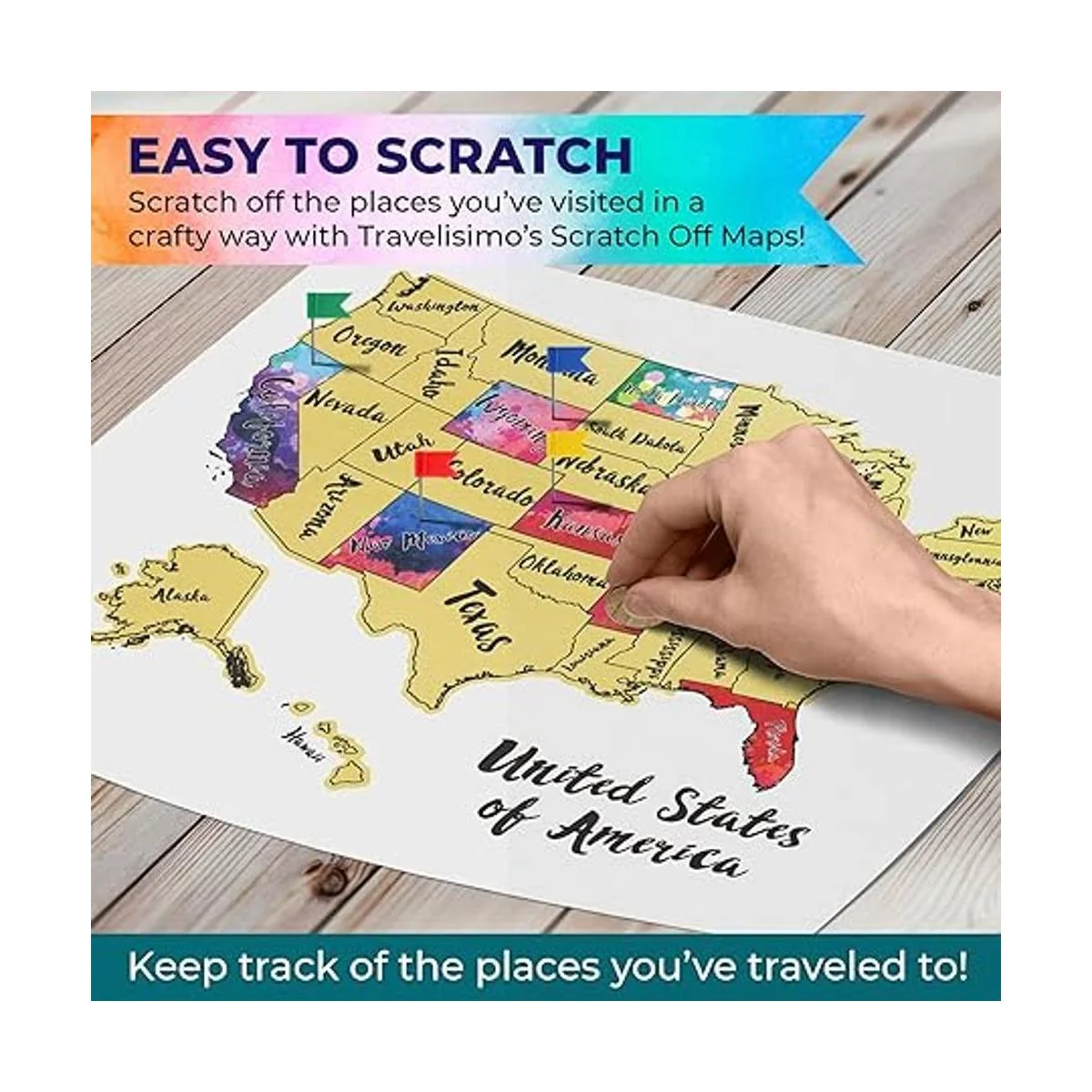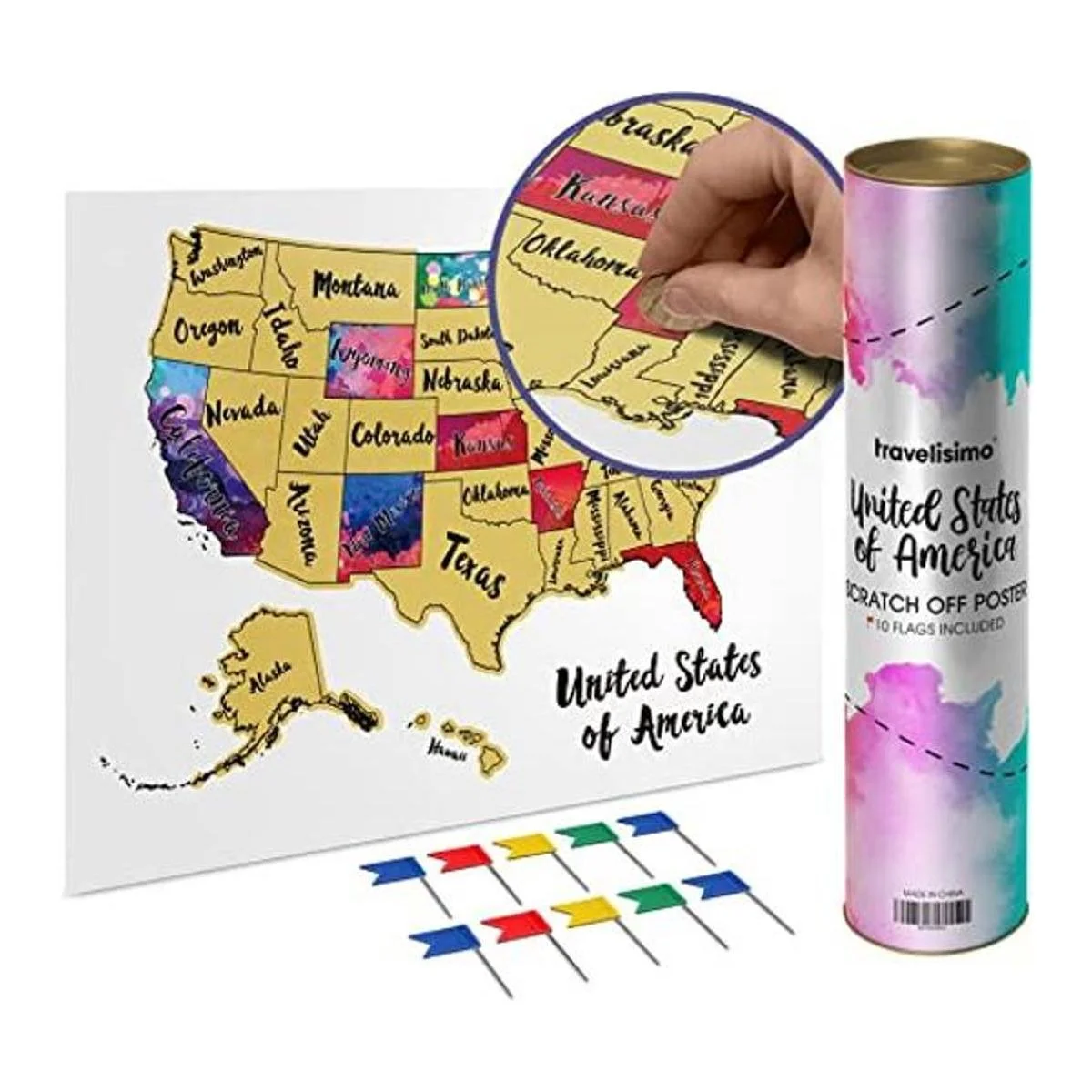 Travelisimo Mapa rascador de Estados Unidos, póster de acuarela de 12 x 17 pulgadas para viaje por carretera, mapa de viaje de Estados Unidos, accesorios para raspar, 10 banderas incluidas para los próximos estados visitados