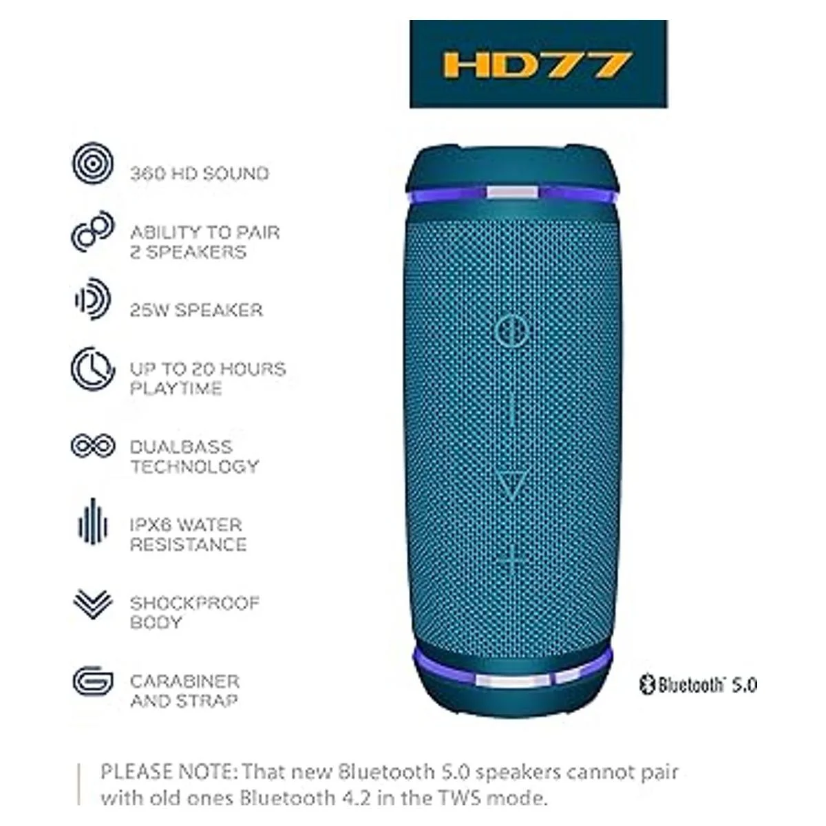 TREBLAB HD77 Azul Altavoz portátil Bluetooth de alta calidad, sonido envolvente HD de 360, emparejamiento dual inalámbrico, 25 W de sonido estéreo, tecnología DualBass, diseño impermeable IPX6 con hasta 20 horas de tiempo de funcionamiento