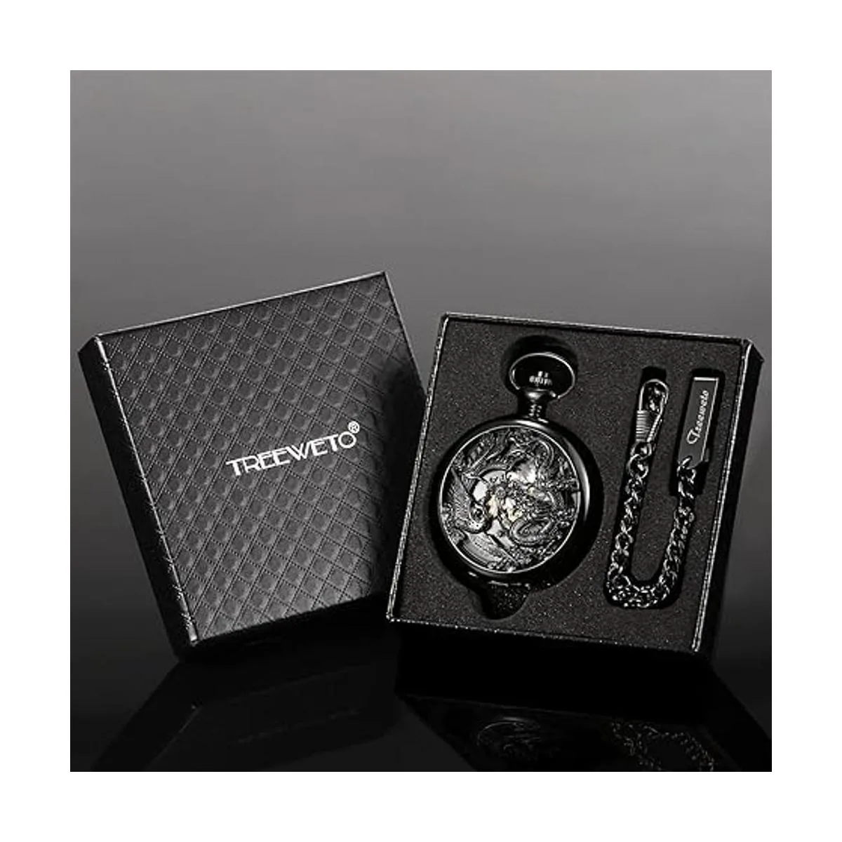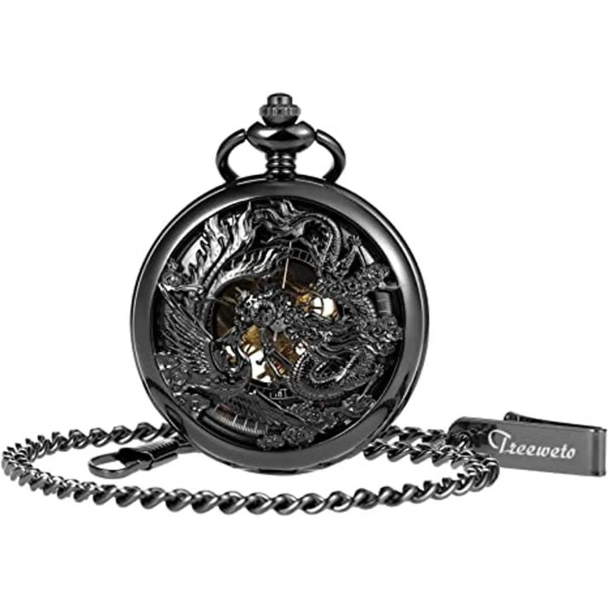 TREEWETO Reloj de bolsillo mecánico de esqueleto para hombre, caja negra con cadena caja de regalo para hombre y niño, Negro, Mecánico
