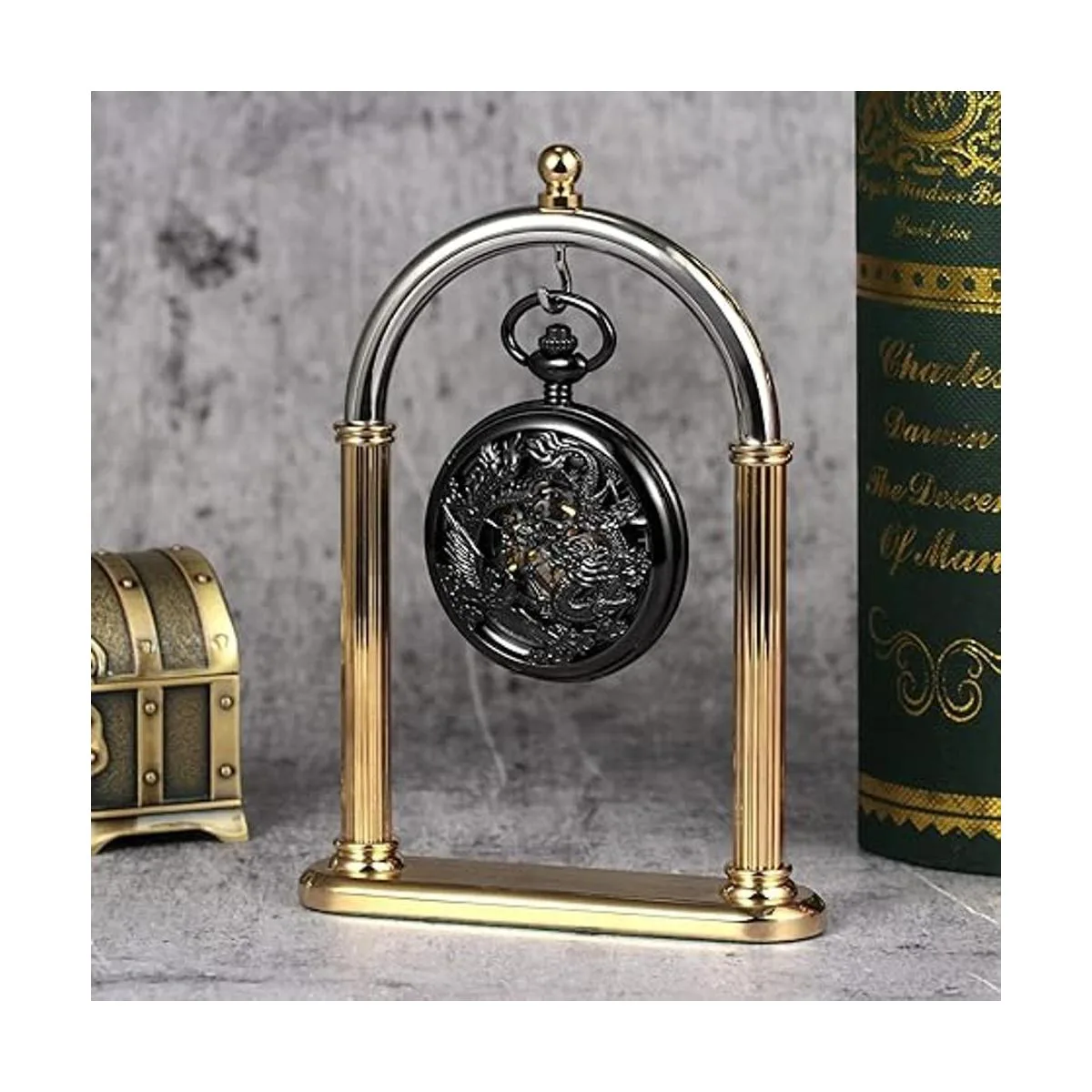 1. Reloj de bolsillo mecánico de esqueleto: cubierta negra con patrones huecos de dragón retro fénix, diseño clásico y único, muy adecuado para accesorios de moda, y también muy bueno con estilo retro.