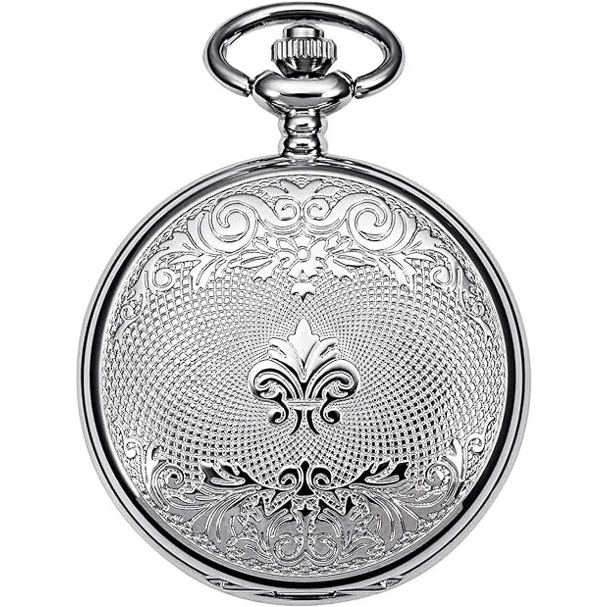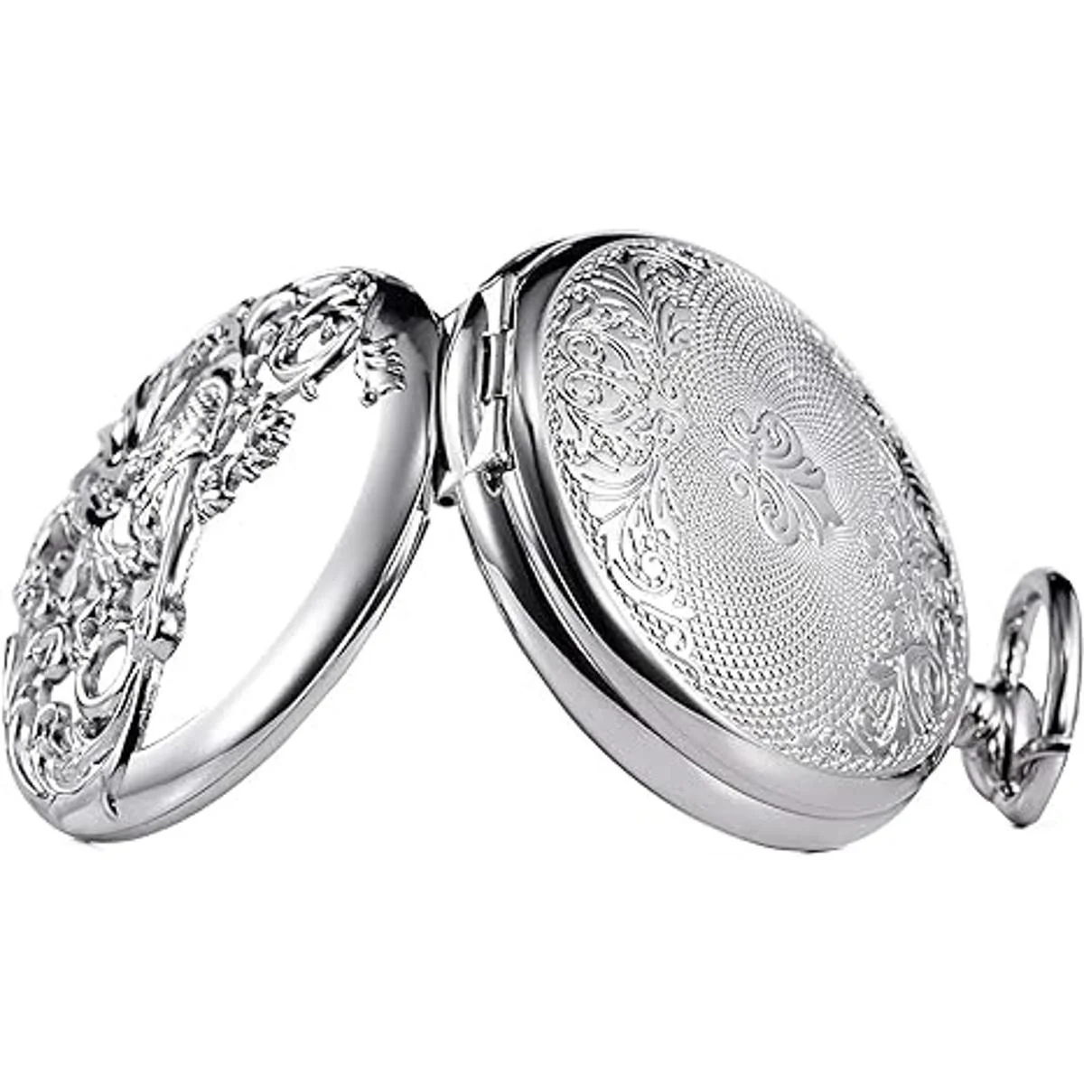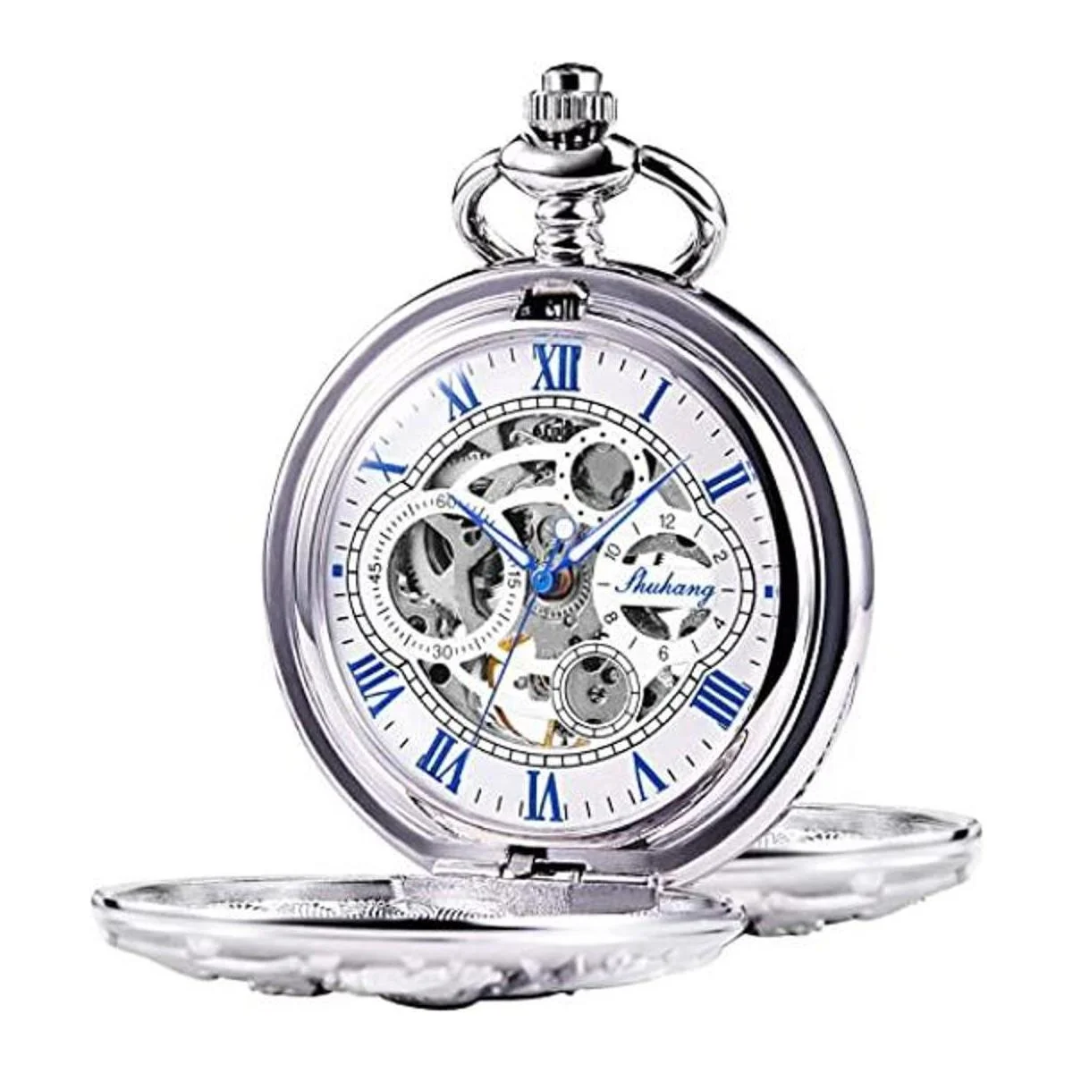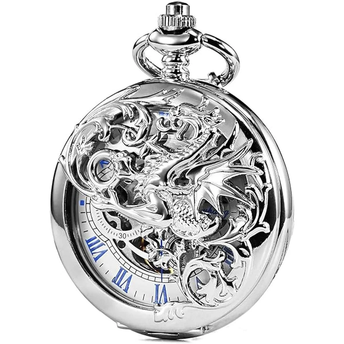 1. Diseño especial: reloj de bolsillo clásico con doble carcasa. Patrón de dragón de ensueño medio cazador, Esqueleto azul números romanos Dial con punteros luminosos. El dragón de los sueños es poderoso, fornido y valiente. Moderno y atractivo. Punteros con forma de flor retro, permiten leer hora fácilmente.