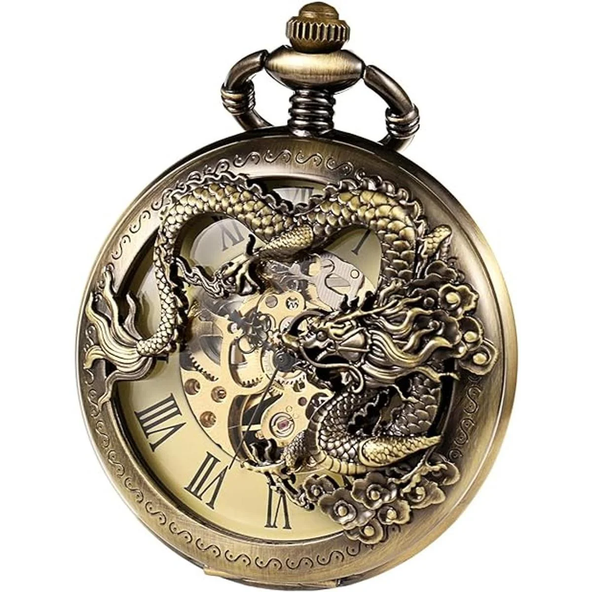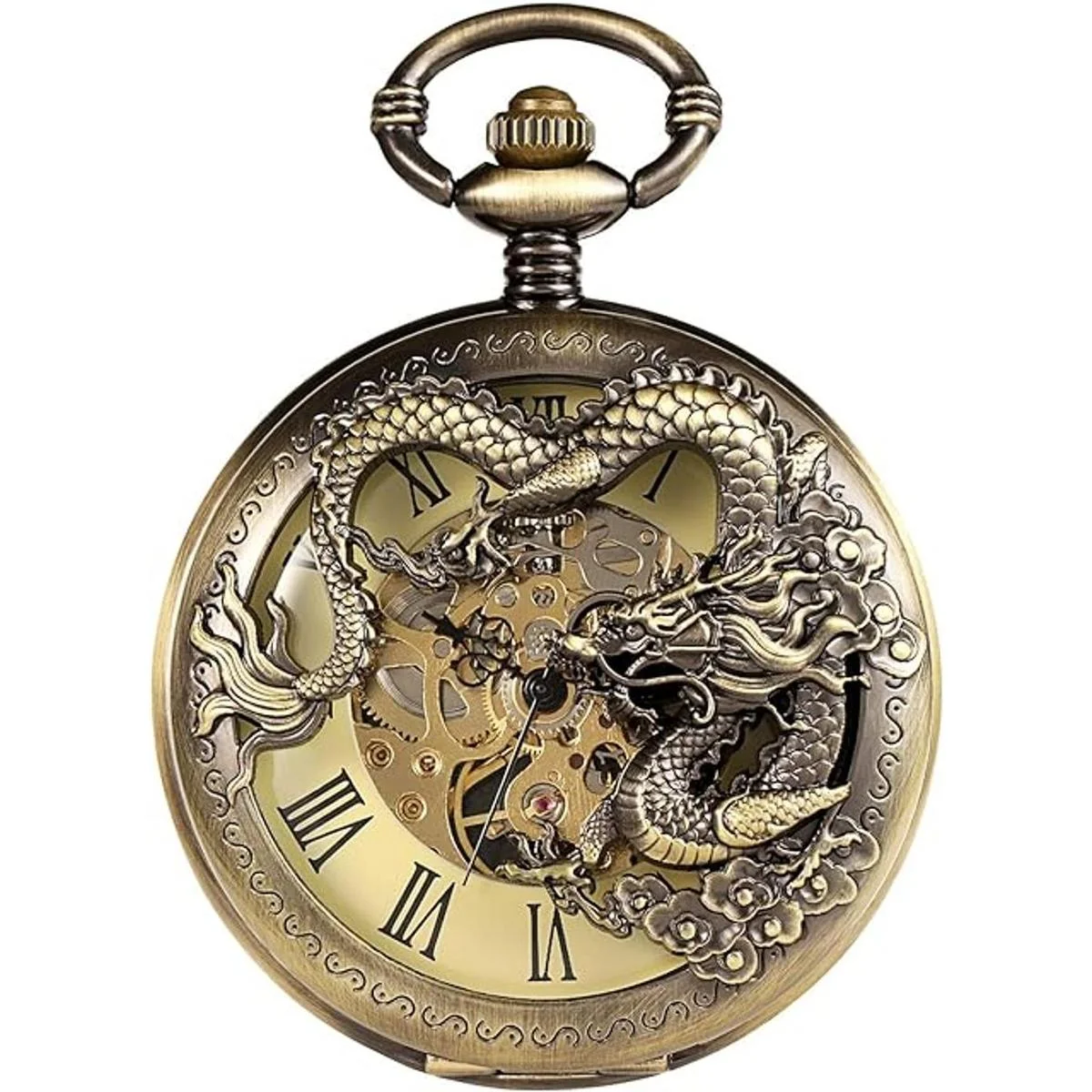 1. Diseño especial: reloj de bolsillo clásico con doble carcasa. Diseño de dragón de ensueño, esfera de esqueleto con números romanos y manecillas de color negro. Dream Dragon significa poderoso, husky y valiente. A la moda y atractivo. Punteros fluorescentes, permiten leer los tiempos en entornos con poca luz.