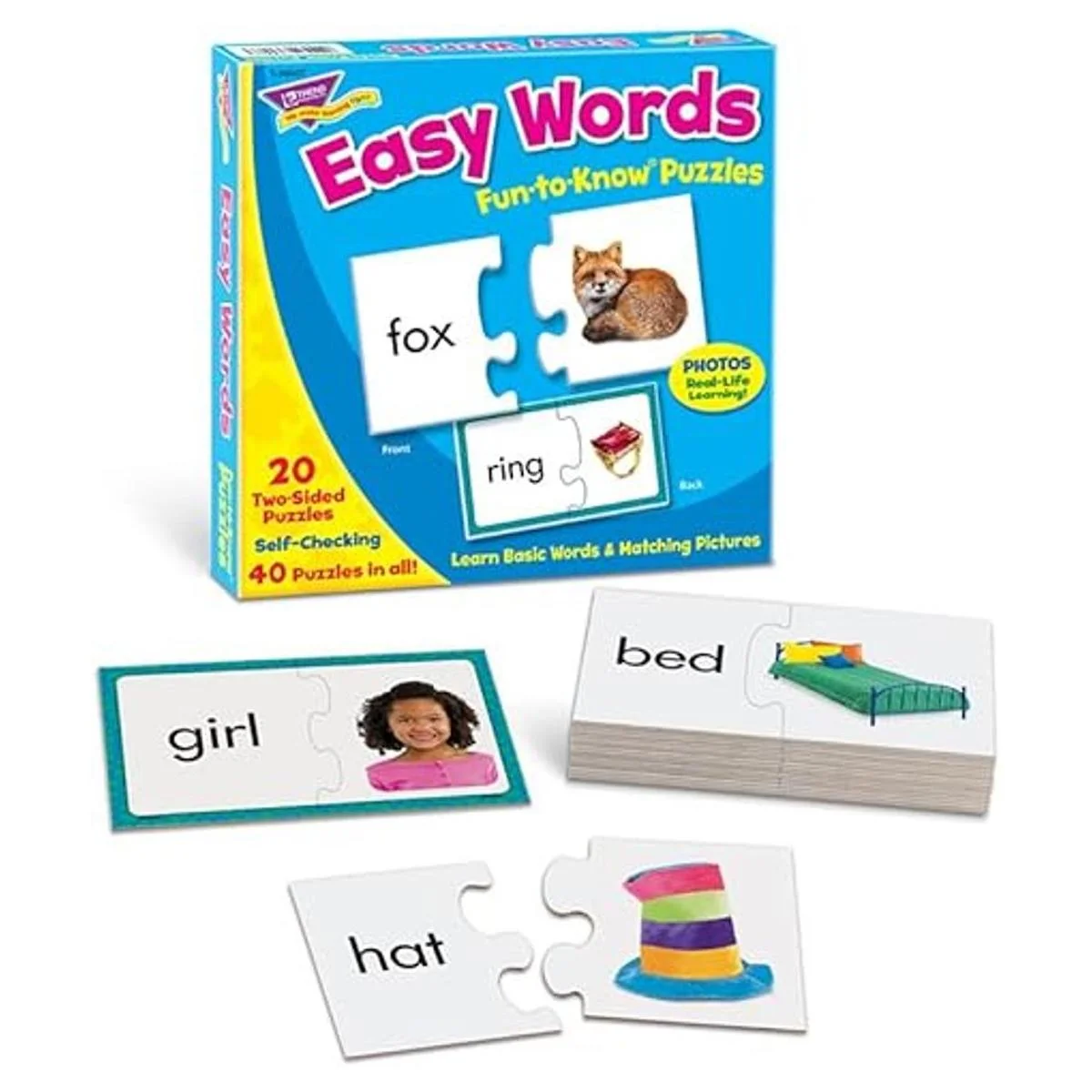 Trend Enterprises FuntoKnow Puzzles Easy Words, Learn Basic Words Matching Pictures, 20 TwoSided Puzzles, SelfChecking, 40 Puzzles Total, for Ages 4 and Up