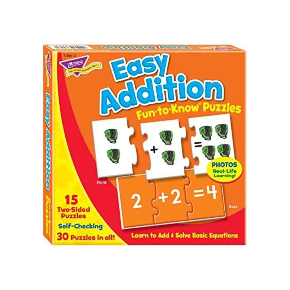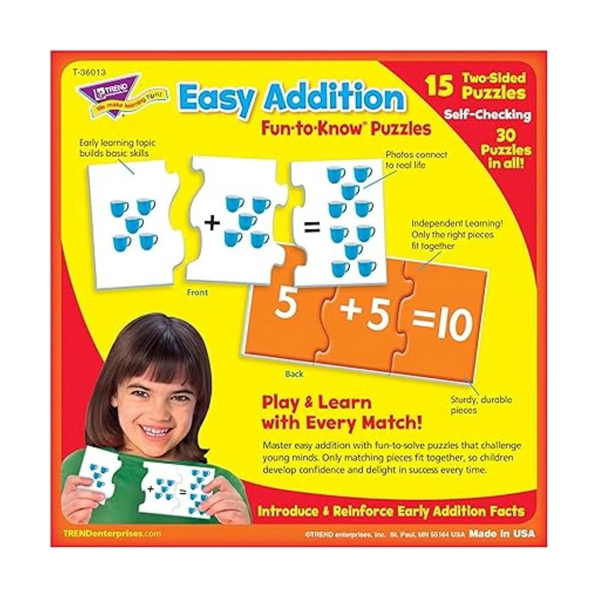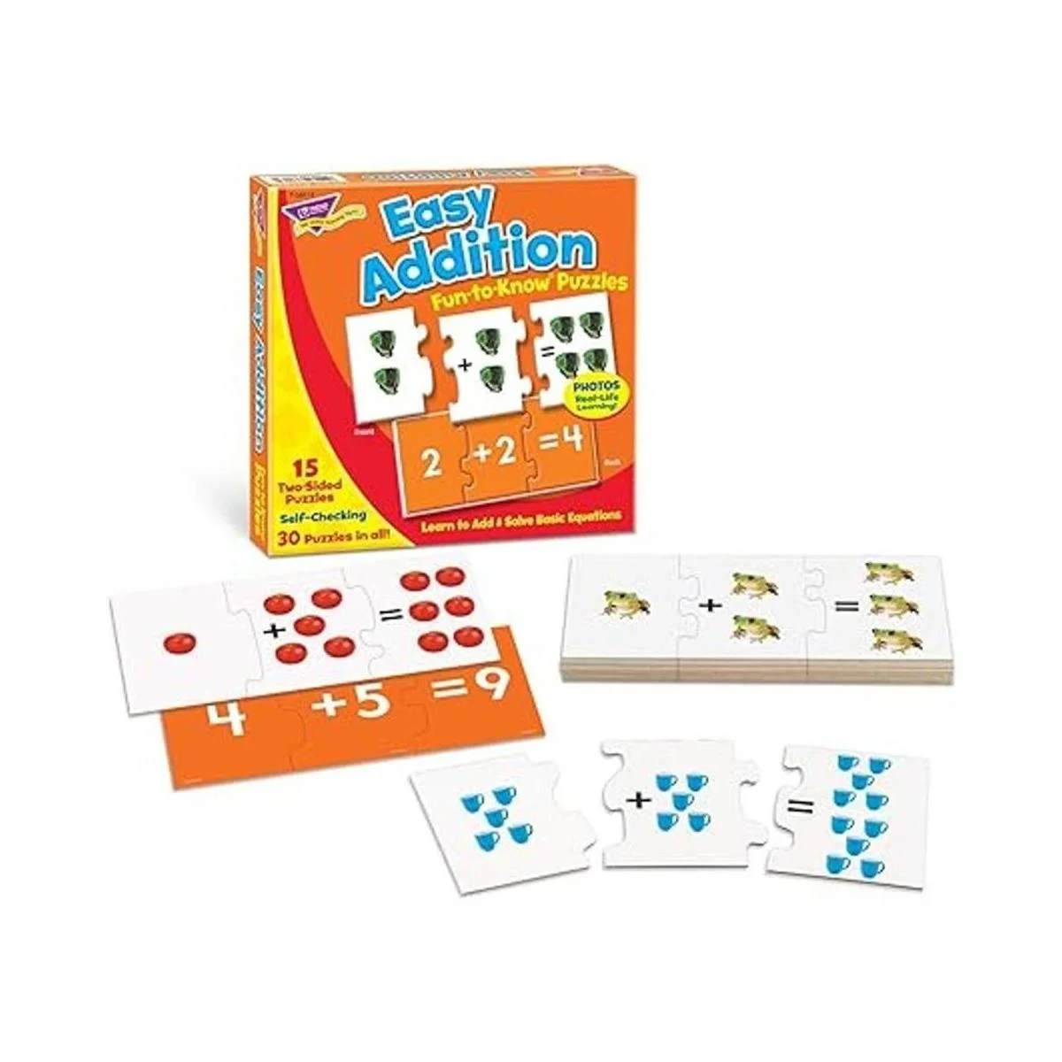 Trend Enterprises rompecabezas divertidos de saber fácil incorporación, aprender a añadir y resolver ecuaciones básicas, 15 rompecabezas de dos caras de tres piezas, autocomprobación, 30 rompecabezas en total, para edades de 4 años en adelante