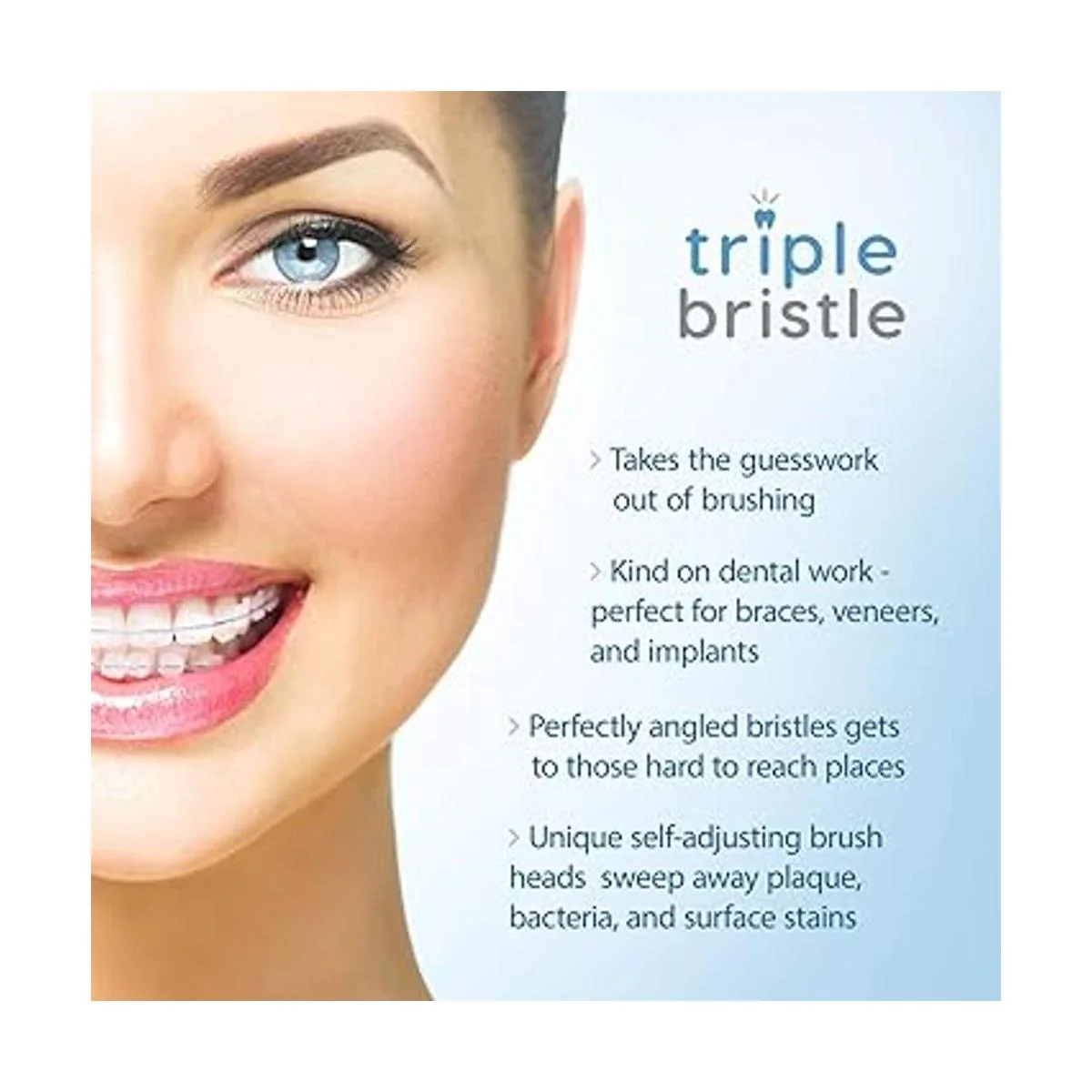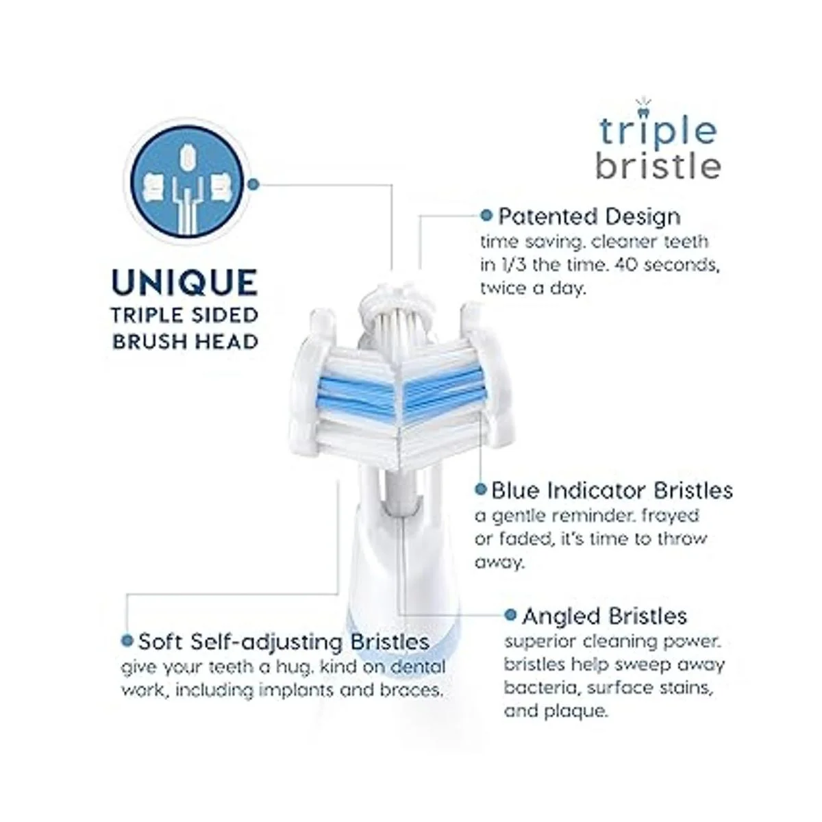 Triple cerdas: nuestro cepillo de dientes sónico con batería AA para viajar tiene un cabezal patentado de 3 lados que hace el trabajo en 1/3 del tiempo. Triple Bristle ha sido científicamente diseñado con 31.000 vibraciones por minuto para dar a tus dientes la mejor limpieza posible en 1/3 del tiempo de un cepillo de dientes sónico ordinario. Las cerdas indicadoras azules se desvanecen lentamente a blanco, recordándote que es hora de reemplazar el cabezal del cepillo.