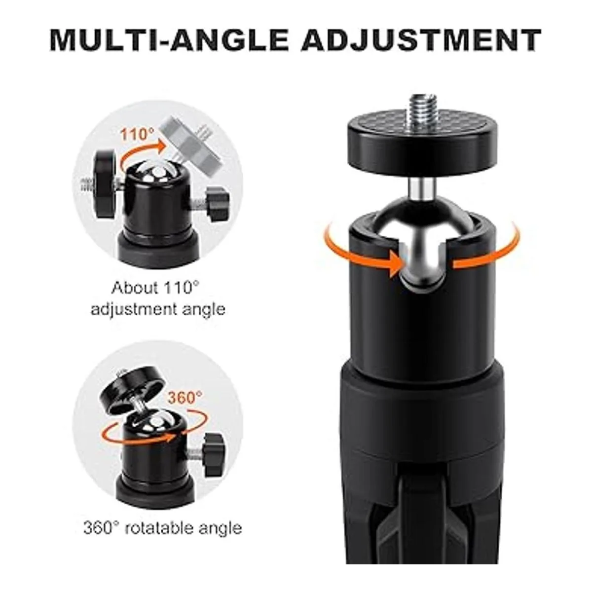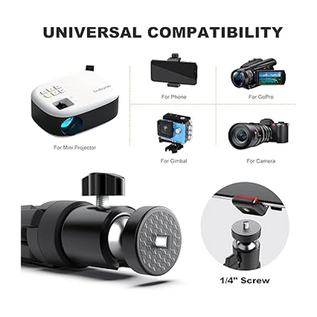 Múltiples ángulos: ángulo ajustable de 360 grados y construcción sólida, elección perfecta para fijar proyectores, cámaras compactas y DSLR y otros dispositivos de interfaz de agujero de tornillos de 1/4.