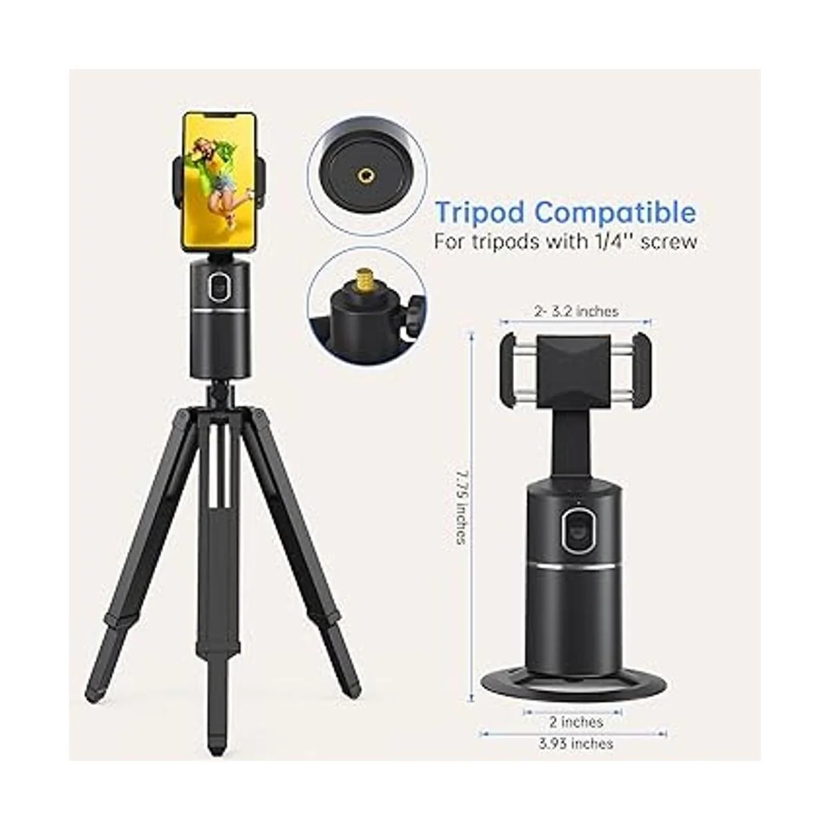 Interfador estándar de 1/4 pulgadas: el soporte de seguimiento inteligente viene con una rosca de tornillo estándar de 1/4 pulgadas en la parte inferior que se puede montar en un trípode y ajustar el ángulo y la altura. El soporte para teléfono incluido se expande de 2 a 4 pulgadas de ancho para adaptarse de forma segura a cualquier tamaño de teléfono celular.