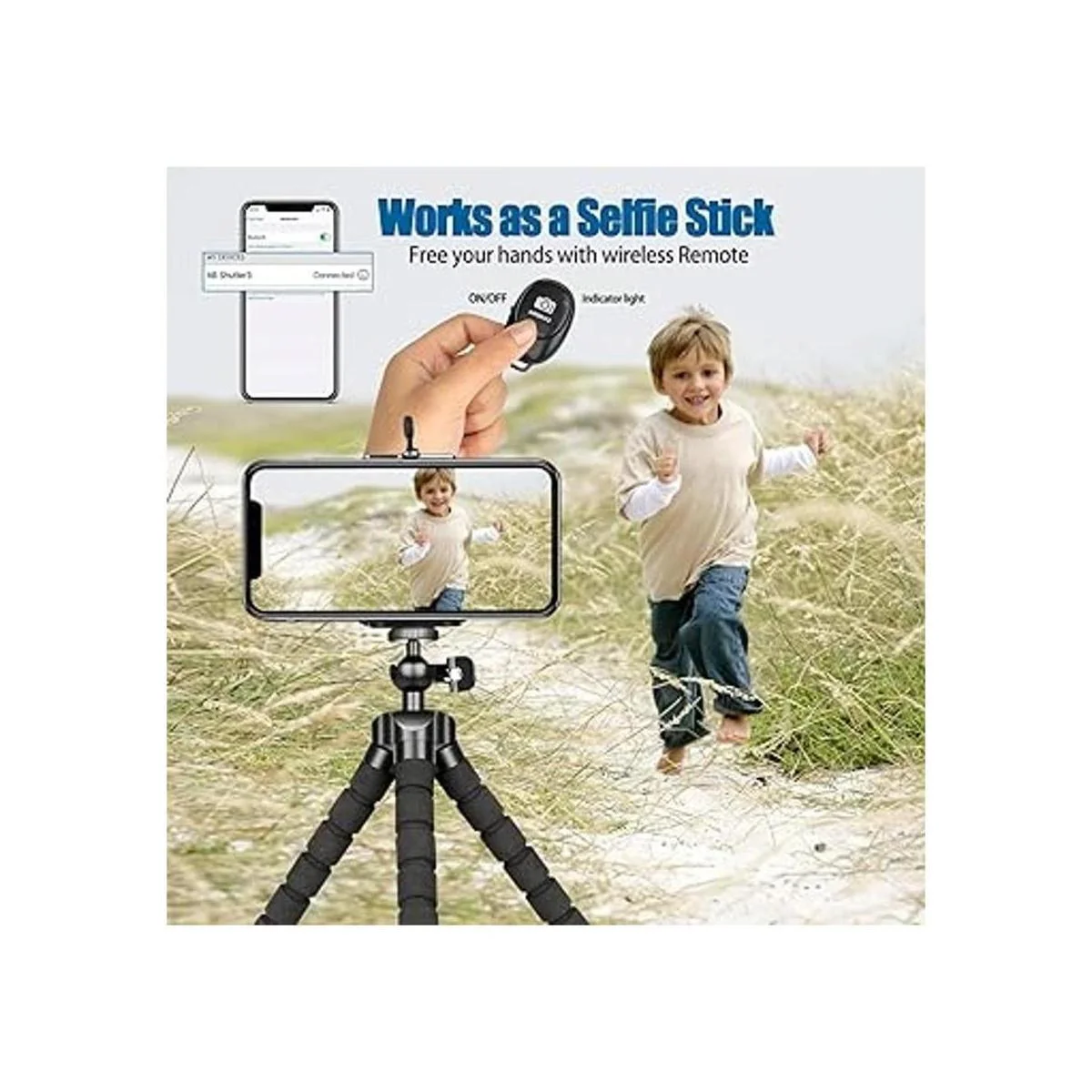 Trípode flexible con control remoto: este trípode celular equipado con un control remoto inalámbrico te permite tomar fotos o videos lejos de una distancia de hasta 32.8 ft, ideal para tomar fotos individuales y grupales con vistas de gran angular. Compatible con teléfonos iOS o Android.