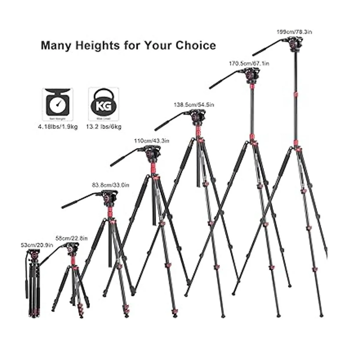 Cabezal fluido profesional: soporta panorama de 360 e inclinado de 90/70. 4.2 libras ligero con carga máxima de 13.2 libras. Se extiende de 22.8 a 78.3 pulgadas. Estándar de 1/4 pulgadas compatible con la mayoría de cámaras DSR y videocámaras. La interfaz extendida de 1/4 pulgadas se puede conectar con accesorios de cámara como luz LED, micrófono, etc.