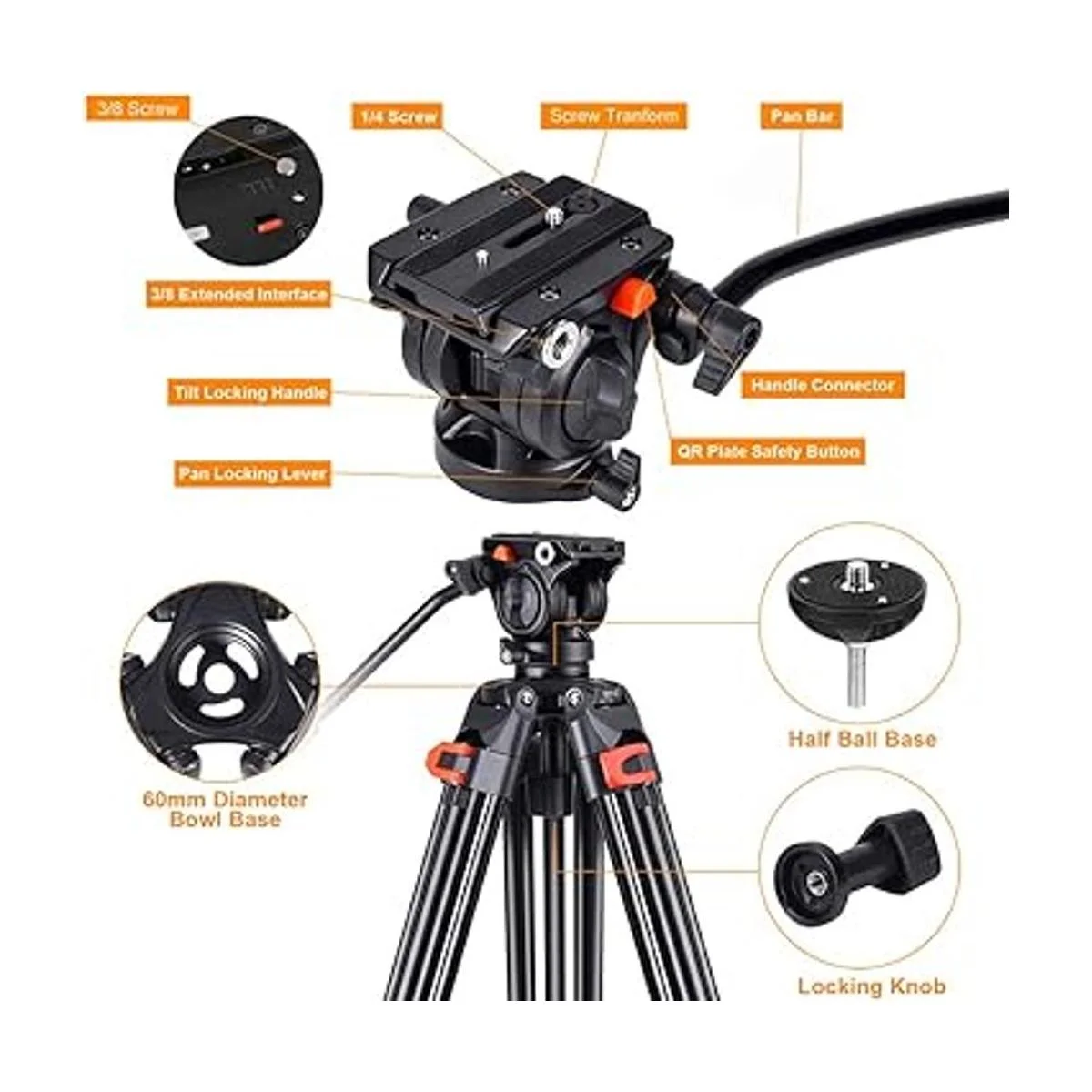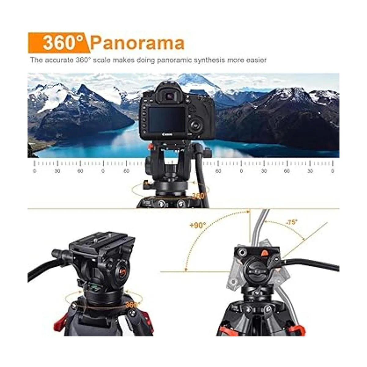 Cabezal de líquido profesional El cabezal puede girar 360 horizontalmente. El sistema de amortiguación y equilibrio dinámico integrado hace que el cabezal del líquido funcione suavemente, puede inclinarse 90/75 verticalmente y la carga máxima es de 13.2 libras.