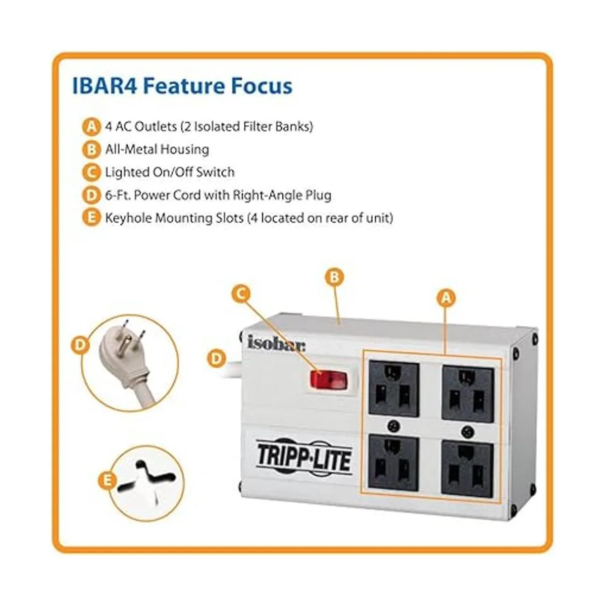 Tripp Lite Isobar Regleta protectora contra sobretensiones de 4 tomas, cable de 6 pies, enchufe de ángulo recto, 330 julios, metal, IBAR46D, gris