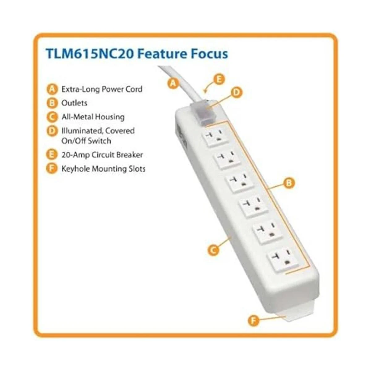 Tripp Lite Tira de alimentación de 6 tomacorrientes para el hogar y la oficina, 20 A, cable de 15 pies con enchufe 520P, TLM615NC20