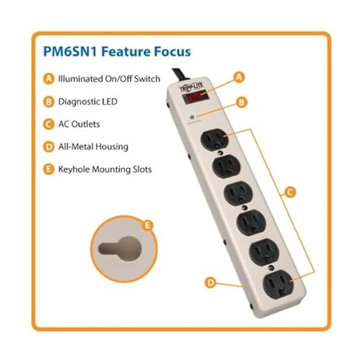 Tripp Lite Tira de alimentación de 6 tomas de corriente, cable de 5.9 ft, grado comercial, metal, PM6SN1