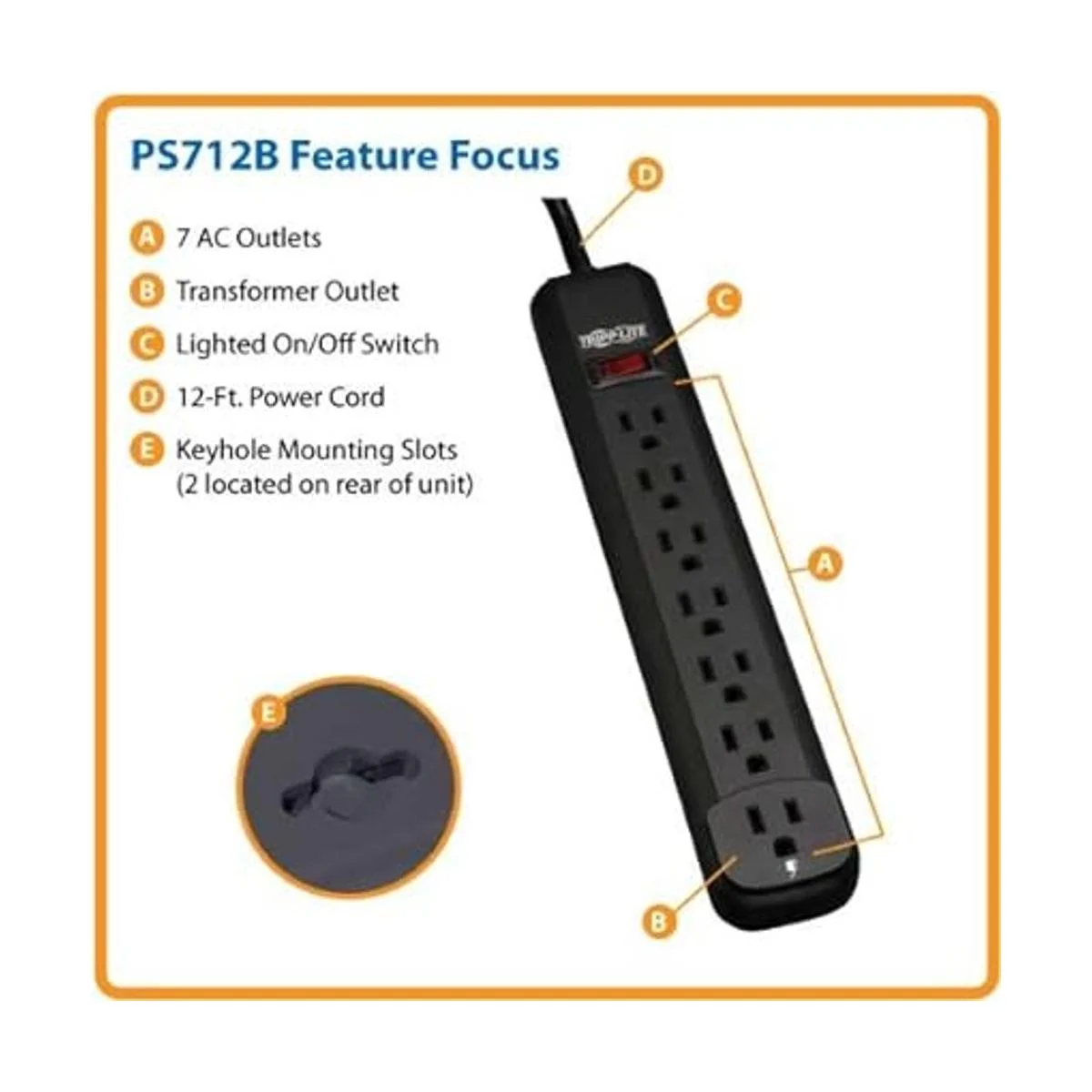 Tripp Lite Tira de Alimentación para Hogar y Oficina de 7 Tomas, Cable de 11.5 ft con Enchufe 515P PS712B Negro