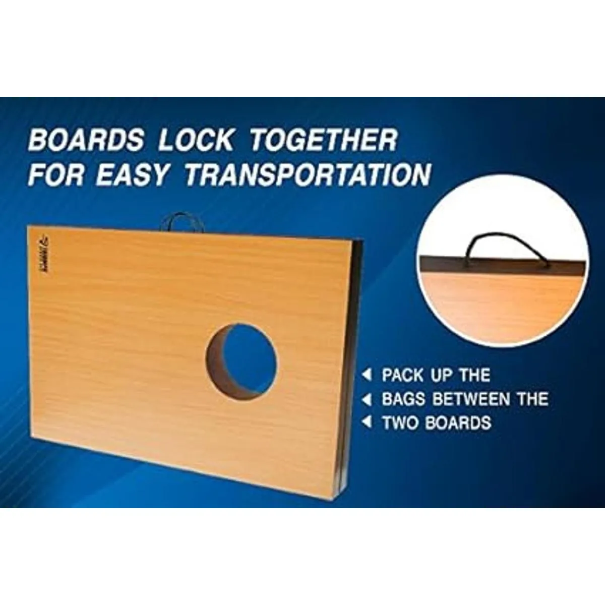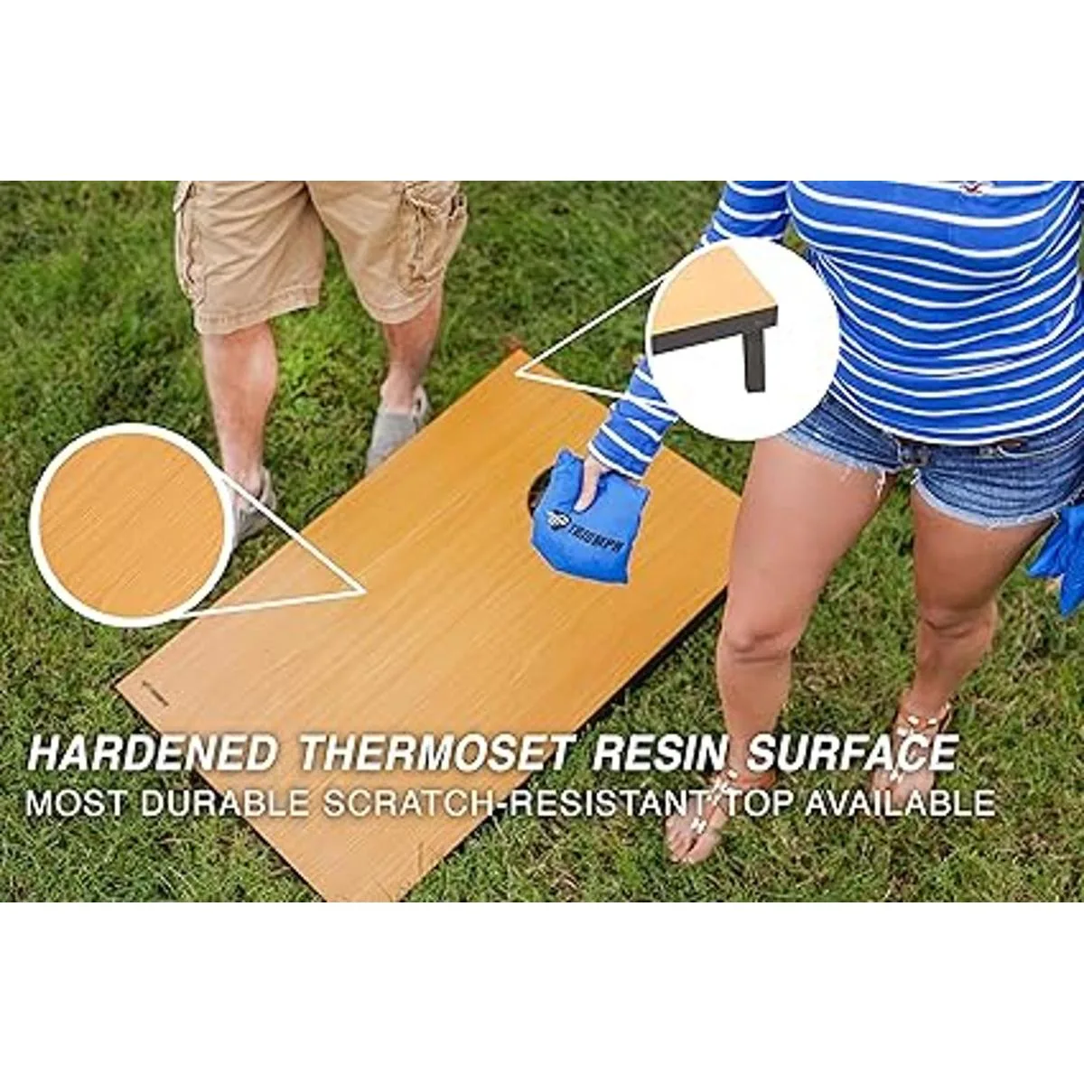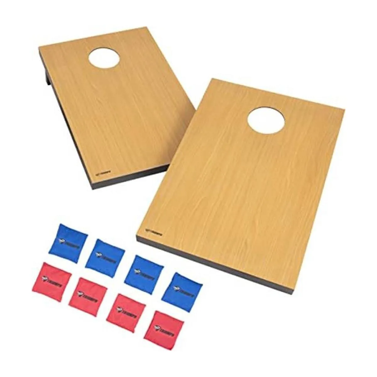 Robusto y compacto juego de Cornhole con superficie laminada de melamina resistente a los arañazos.