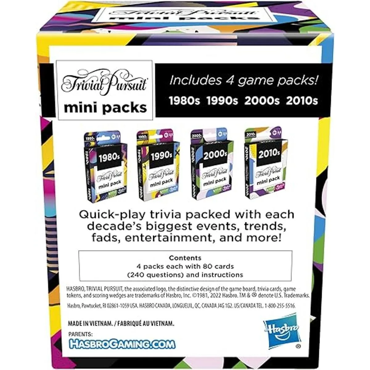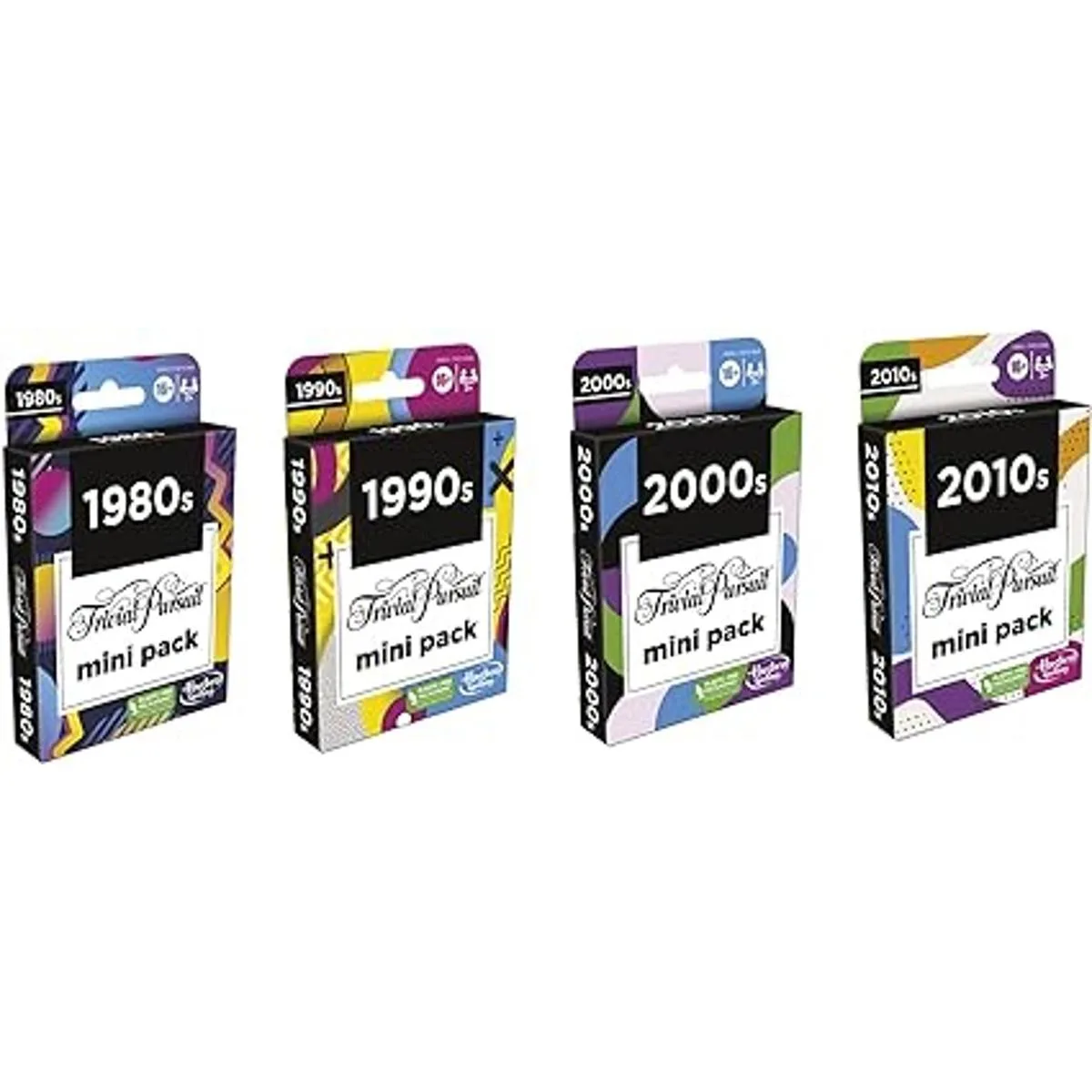 Trivia a través de las décadas: este paquete múltiple de mini paquetes Trivial Pursuit Game incluye 4 paquetes de juego diferentes, lo que te da 4 décadas de preguntas de trivia de los años 80, 90, 2000 y 2010